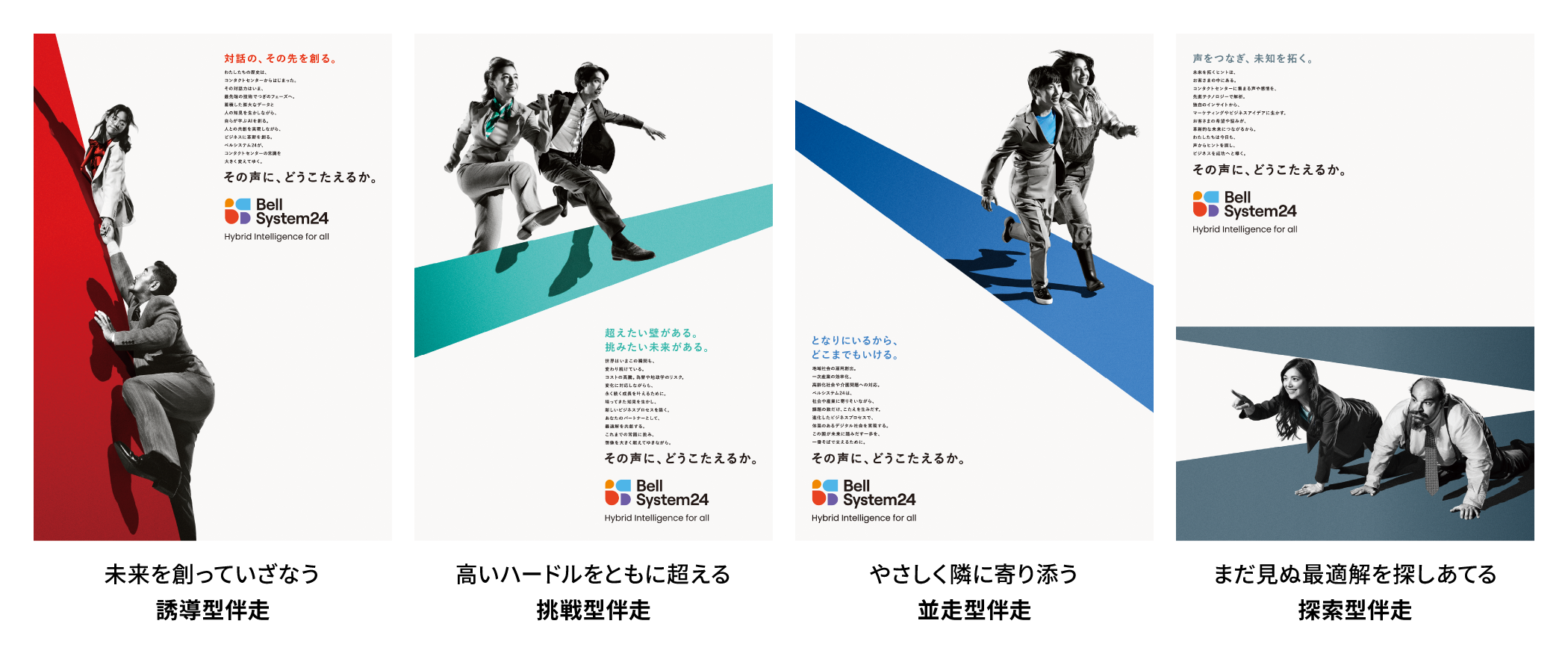 新たなキービジュアルは、“成功に伴走するビジネスパートナー”としての当社の在り方を、ブランドメッセージとして打ち出しています。お客様が抱える課題に向き合い、その解決を通じて事業成長を支援する当社の姿勢を、「いざなう(誘導型伴走)」「ともに超える(挑戦型伴走)」「寄り添う(並走型伴走)」「探しあてる(探索型伴走)」という4つのアプローチで表現しています。