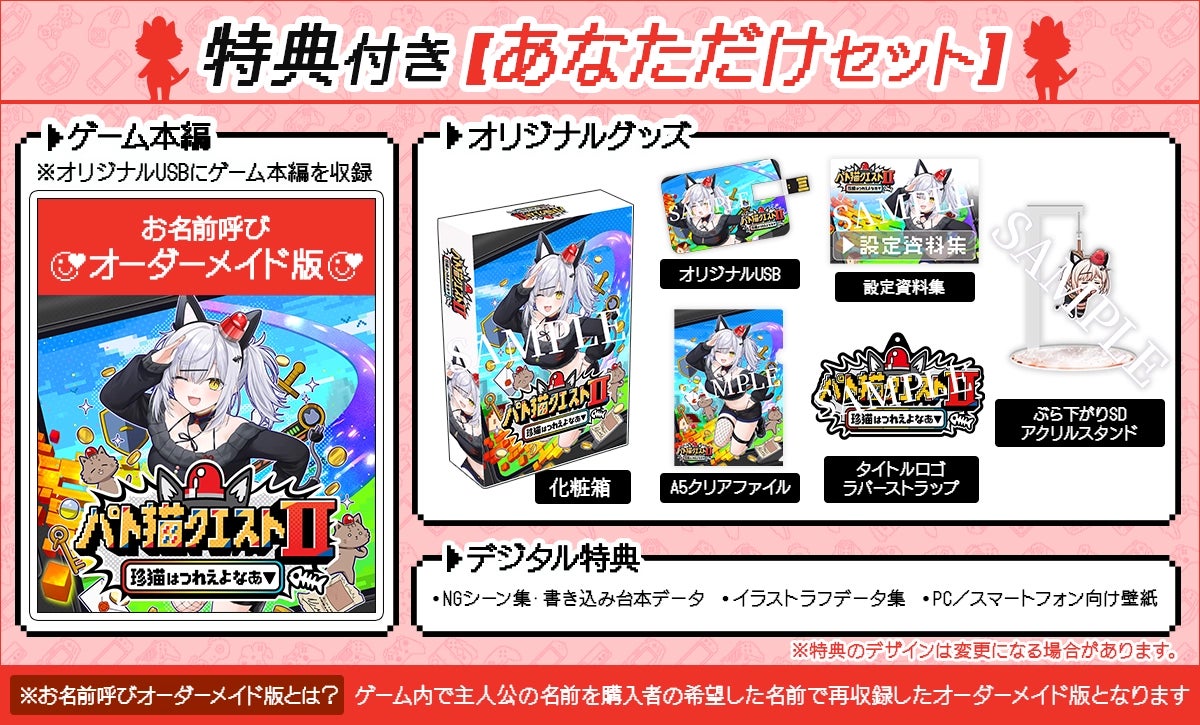 2025年11月7日(金)0:00より予約開始する『あなただけセット』は、購入者であるあなたの名前を猫元パトが特別に収録し呼んでくれるオーダーメイド版のゲーム本編が収録された先着50名限定の商品です。