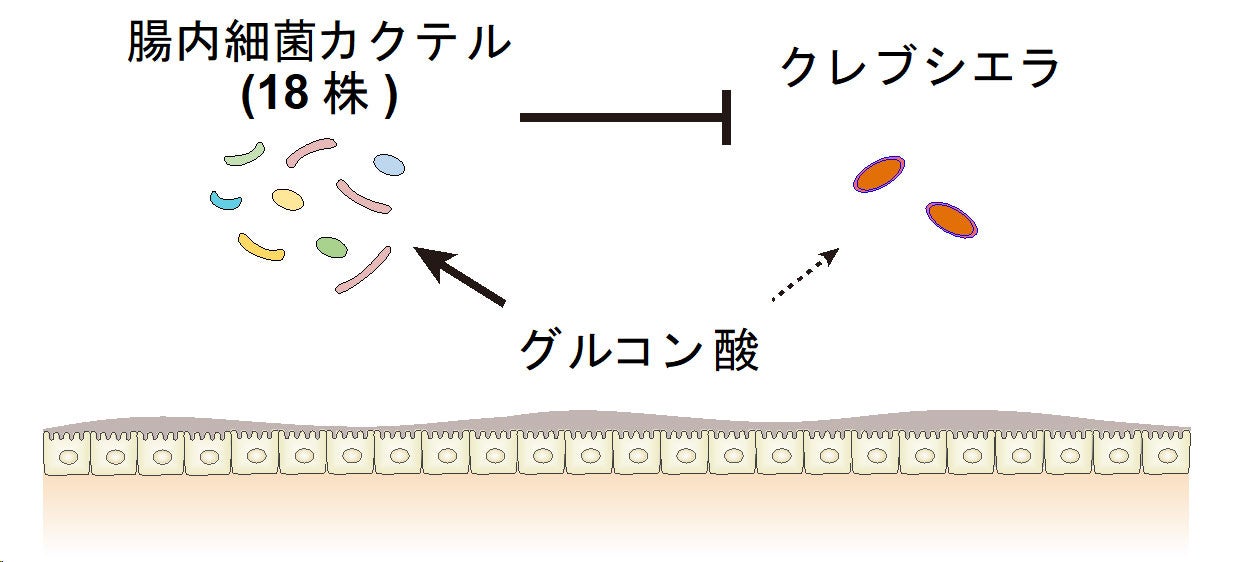 慶應義塾大学医学部微生物学・免疫学教室の本田賢也教授を中心とする共同研究グループは、健常者の腸内常在細菌の中から、腸管内でクレブシエラや大腸菌の抑制に重要な働きをしている18種類の菌を同定しました。この18種類の菌を混ぜ合わせて一緒に投与することで、腸管内のクレブシエラや大腸菌を1/1000以下に減少させる効果があることがマウス実験で確認されました。さらに、これらの18種類の菌はクレブシエラの主要なエネルギー源であるグルコン酸をより多く消費し、その結果としてクレブシエラの増殖を抑制していることを突き止めました。