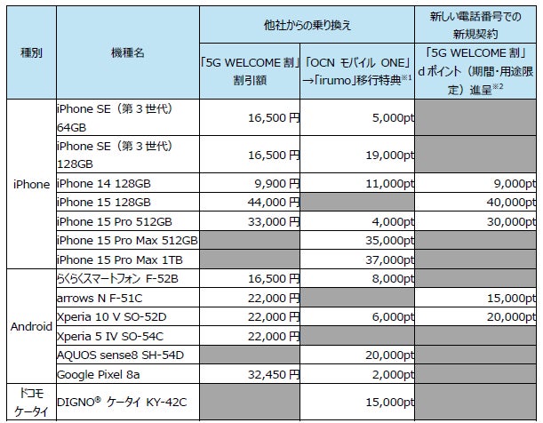 また、機種販売の開始を記念して、「irumoサイト」にて、「OCN モバイル ONE」から「irumo」へ乗り換えの ご契約と同時に、対象のスマートフォンをご購入いただいたお客さまに、dポイント(期間・用途限定)を進呈する※5「『OCN モバイル ONE』→『irumo』移行特典」(以下、本特典)を本日から開始いたします。一部機種を対象に、「5G WELCOME割」に加えて本特典の適用が可能です※6。