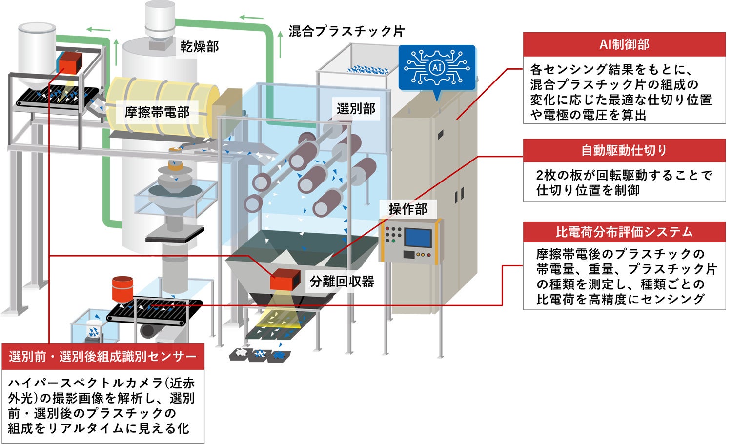今回、「スマート静電選別」のキー技術となる、プラスチック片の選別前・選別後組成識別センサーおよび識別アルゴリズムや、プラスチック片の比電荷(※4)をセンシング可能な独自の比電荷分布評価システム、センシング結果に応じて選別機を最適な条件に自動制御するAI技術を開発し、これらを搭載した検証機を製作しました。この検証機を用いて、あらゆるプラスチックの組成に応じて、専門知識やオペレーションノウハウがなくても自動で高純度に選別できることを検証していきます。