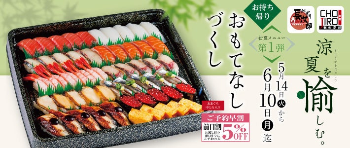 株式会社フーズネット(本社・⼤阪府⼤阪市、代表取締役社⻑・加藤誠)が運営する「活⿂廻転寿司にぎり⻑次郎」 「廻転寿司CHOJIRO京都」は、5/14(火)から初夏メニュー -第1弾- の販売を開始いたします。期間は6/10(月)迄の4週間で、GWから入荷中のしまあじに加えいさきやいわし、万願寺唐辛子や九条ねぎなどの関西の旨い野菜も取り揃えました。