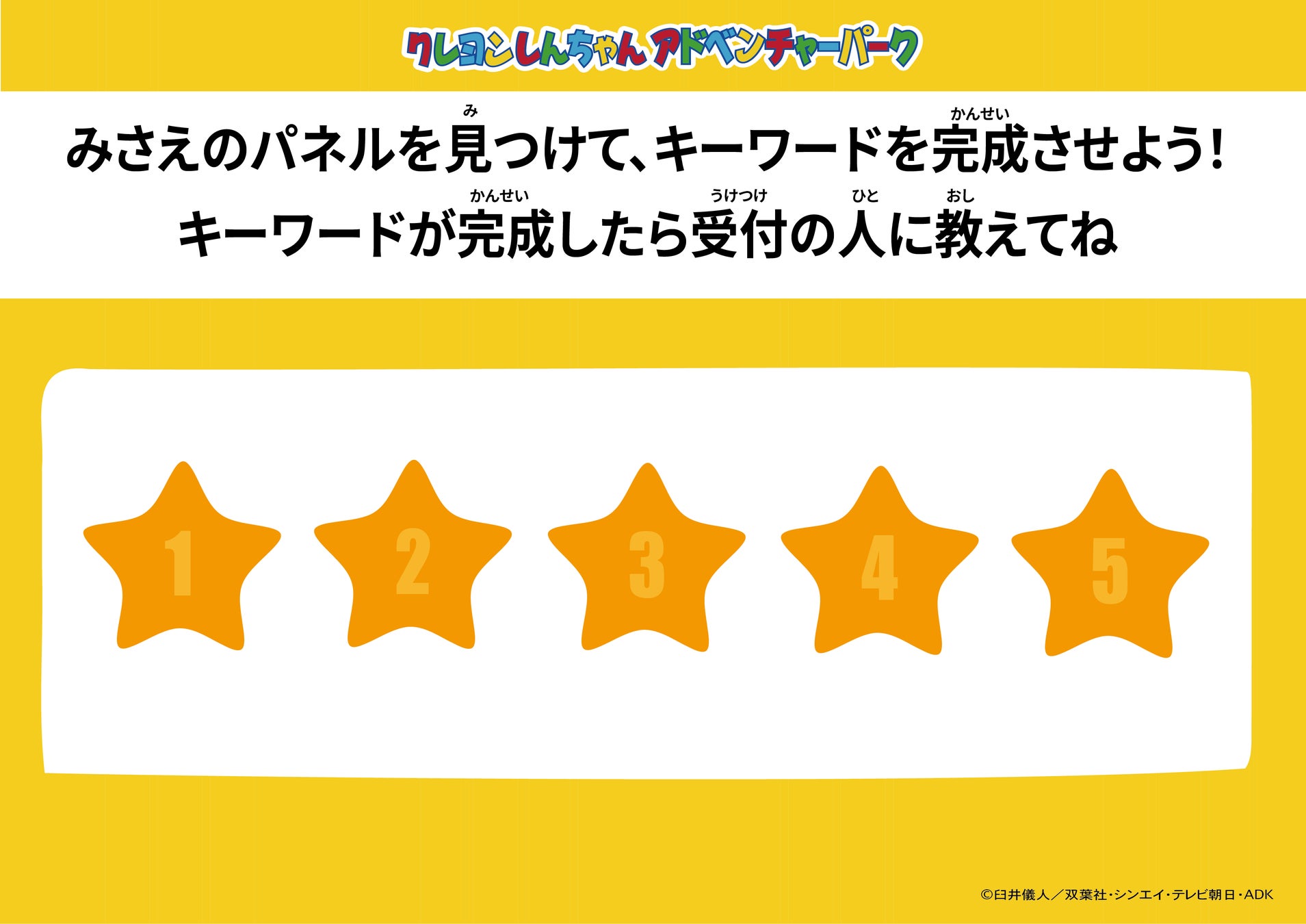 「クレヨンしんちゃんアドベンチャーパーク」内に設置されたキーワードパネルを探しながら、“野原みさえのメッセージ”を探して回るゲーム。みさえからのメッセージを見つけ出し受付のスタッフに伝えると、みさえを中心に仲良く集合した野原家が プリントされた、ニジゲンノモリ限定のシールをプレゼント