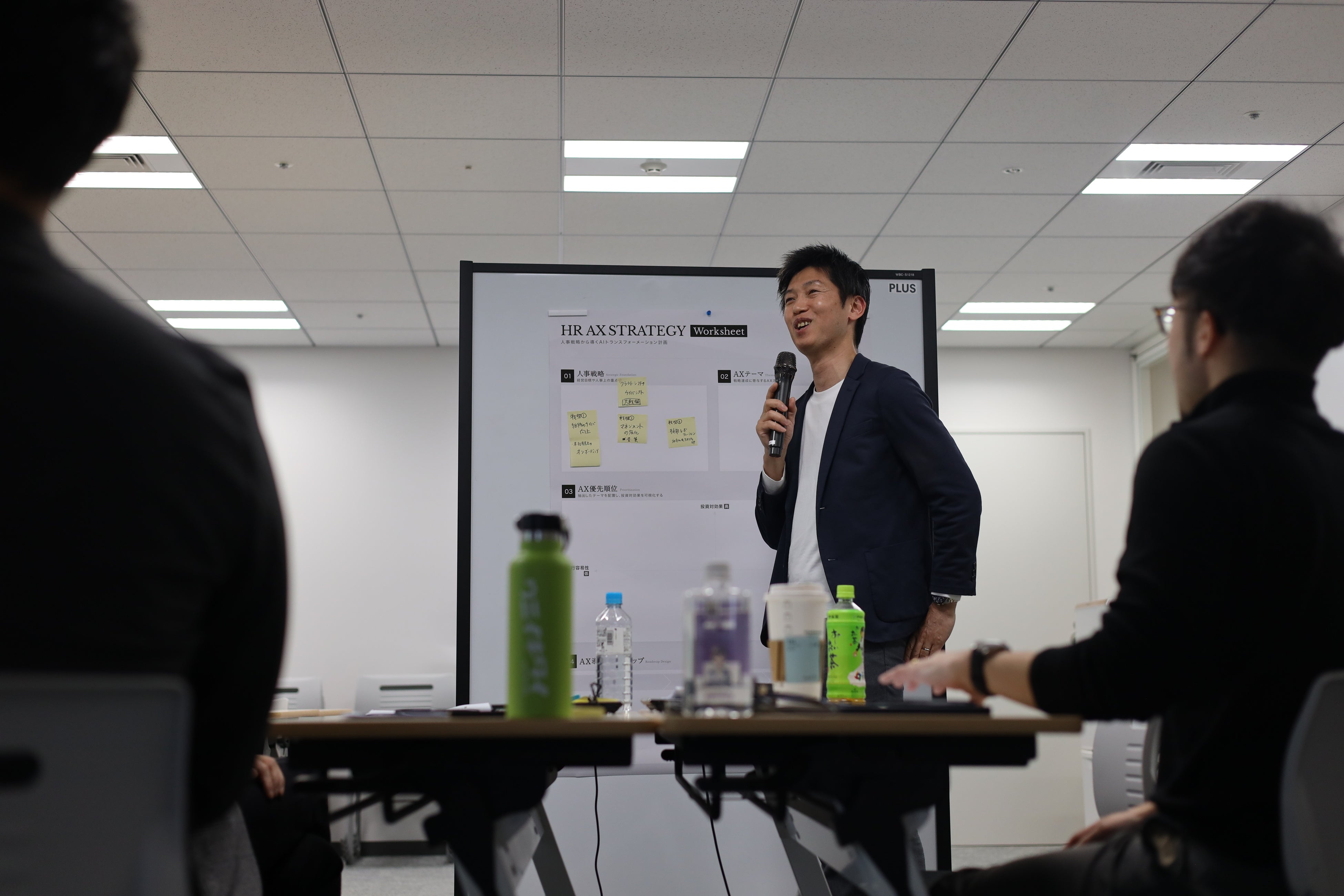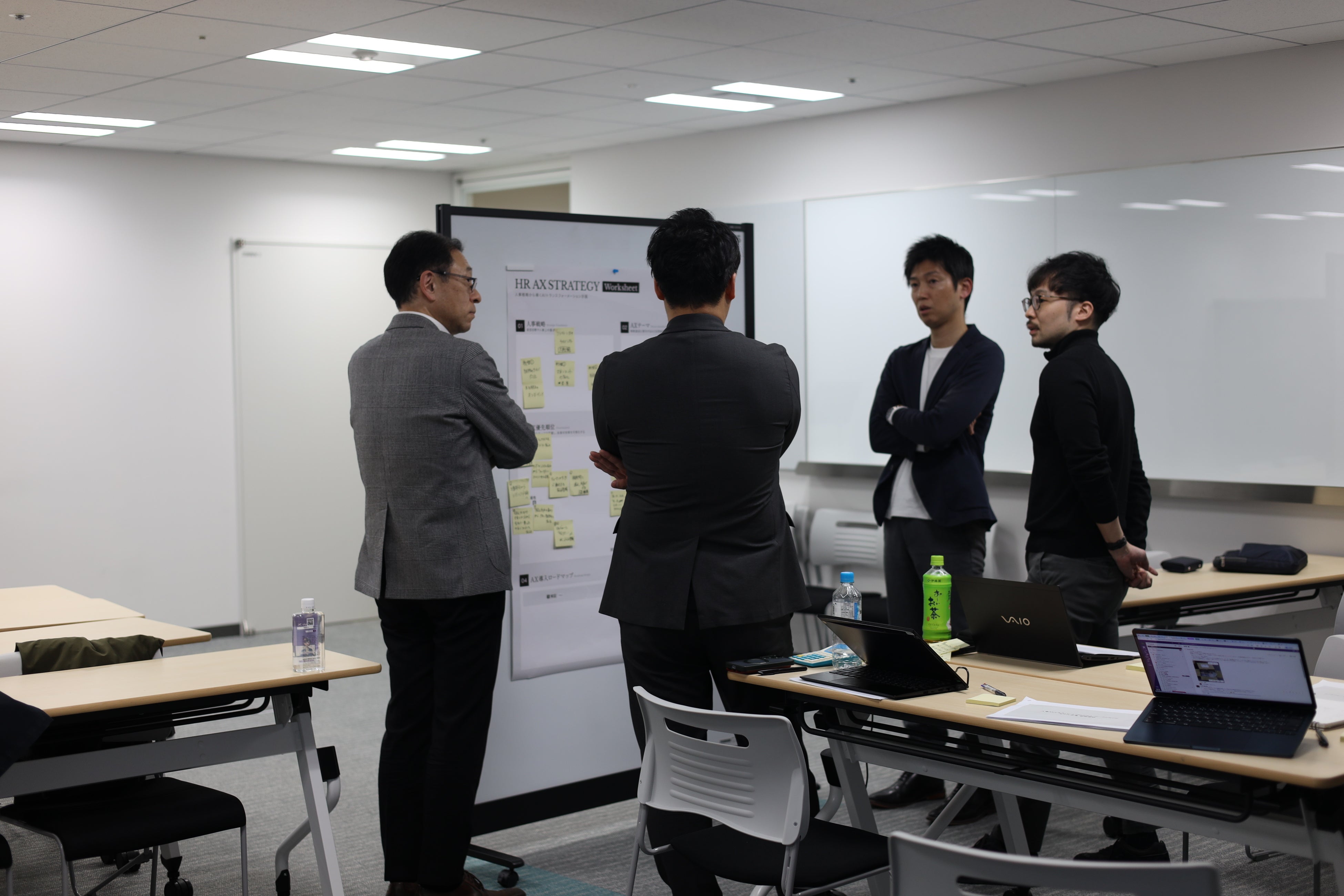 架空のモデル企業を題材に、「AIありき」ではなく「戦略起点」でAX計画を立案するグループワークを実施しました。人事戦略の定義からAXテーマの検討・優先順位付け・ロードマップ設計(PoC→Pilot→Scale)までを段階的に整理し、最後に各チームが発表を行いました。