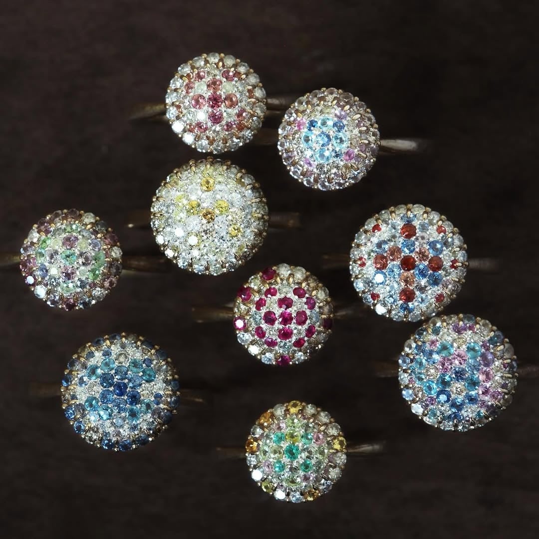 ブルージルコンやオレンジサファイア、レッドスピネルなど、鮮やかな色石を贅沢に揃えたラインアップ。冬の光に映える透明感と色彩の輝きをお楽しみいただけます。