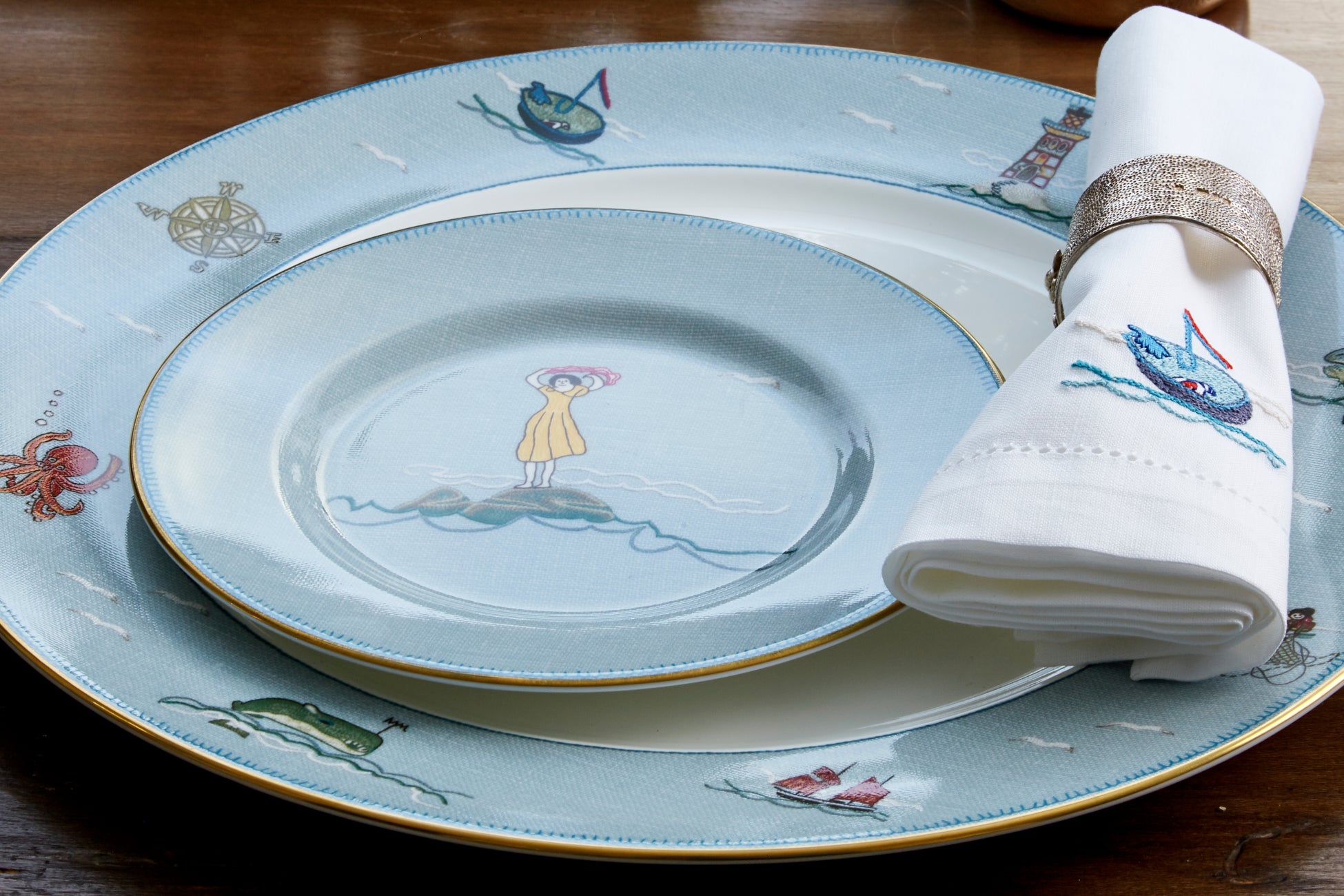 キット・ケンプはシンプルで叙情的なフォークアートへの愛を高級食器に実現することに喜びを感じており、現在、ニューヨークとロンドンで彼女が共同経営する10のブティックホテルのうち2つのホテルで「セイラーズ フェアウェル」が使用されています。