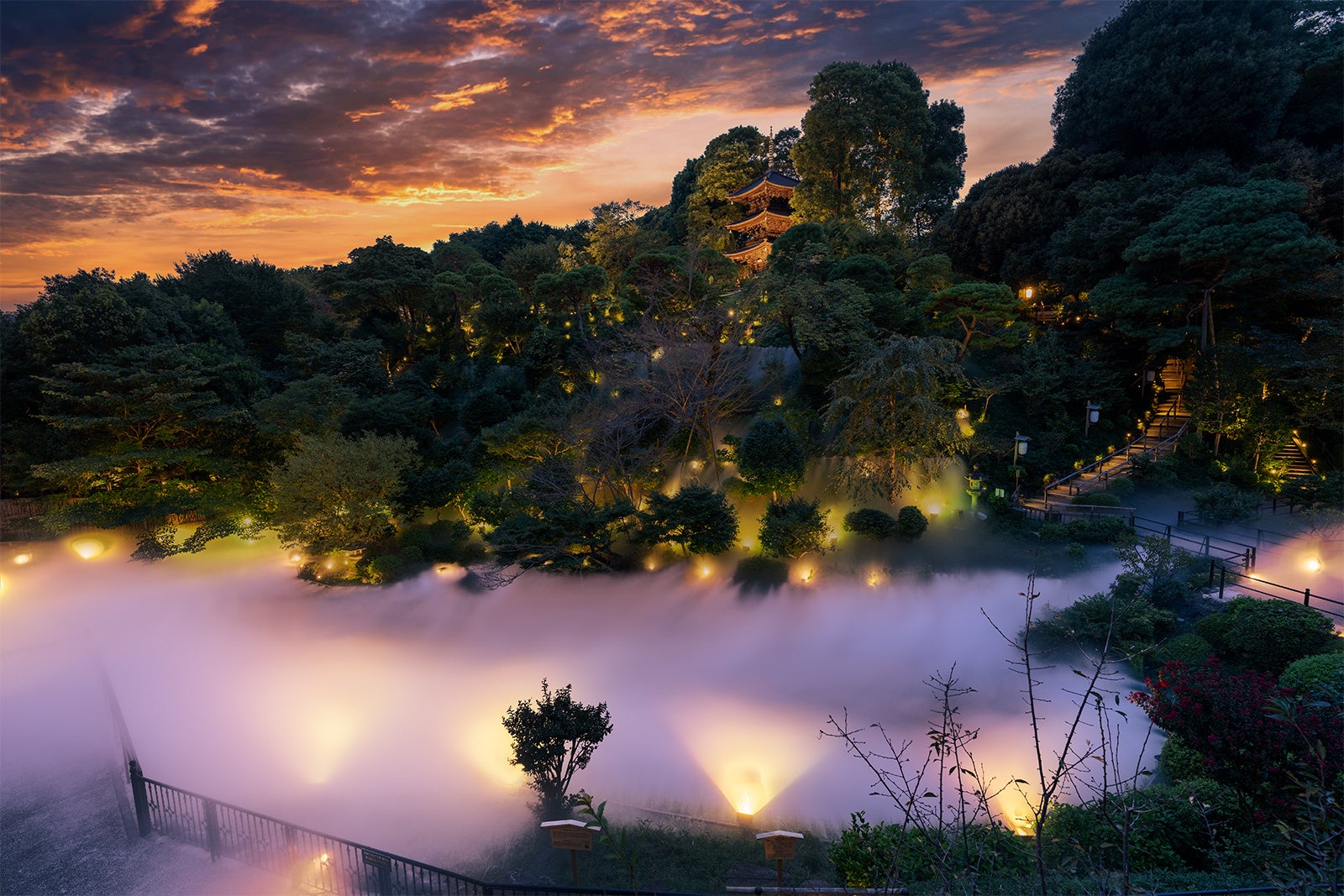 散策できる広大な庭園には、国の有形文化財の三重塔や茶室、史跡があり、また春の桜、きらめく新緑、初夏の蛍、夏の涼やかな滝のしぶき、紅葉、雪景色の中の椿と、四季の風情が東京にいることを忘れさせる特別なひとときをお過ごしいただけます。又、国内最大級の霧の庭園演出「東京雲海」も都心の絶景として通年お楽しみいただけます。