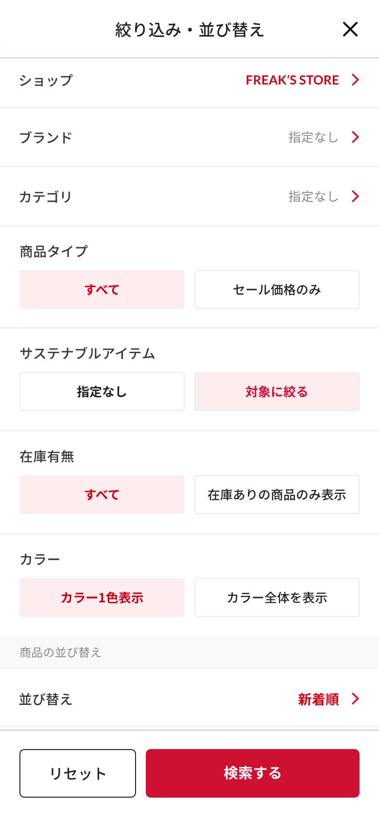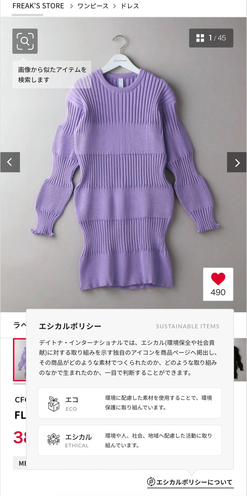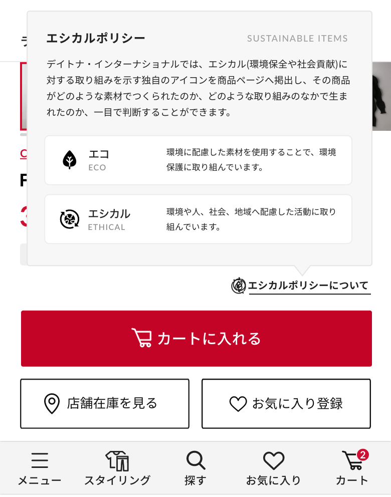 従来の属性やキーワード検索だけでなく、サステナブルに対する取り組みを示す「サステナブルアイテム」を新たにカテゴリーへ追加しました。「エコマーク」「エシカルマーク」の独自アイコンを商品ページへ掲出し、その商品がどのような素材でつくられたのか、どのような取り組みのなかで生まれたのか、判断することができるようになりました。