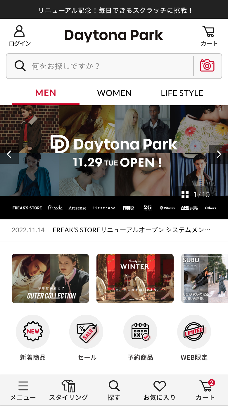 株式会社デイトナ・インターナショナルは、自社オンラインストア「FREAK'S STORE ONLINE SHOP」のコンセプトとデザインを全⾯リニューアルしました。「あらゆるひとが思い思いに楽しみながら、新たな好きに出会い、つながるコミュニティ」をコンセプトに、特定ブランドのカラーに偏らずシンプルでスタイリッシュなデザインでモール化した「Daytona Park(デイトナパーク)」を2022年11月29日(火)新たにローンチしました。