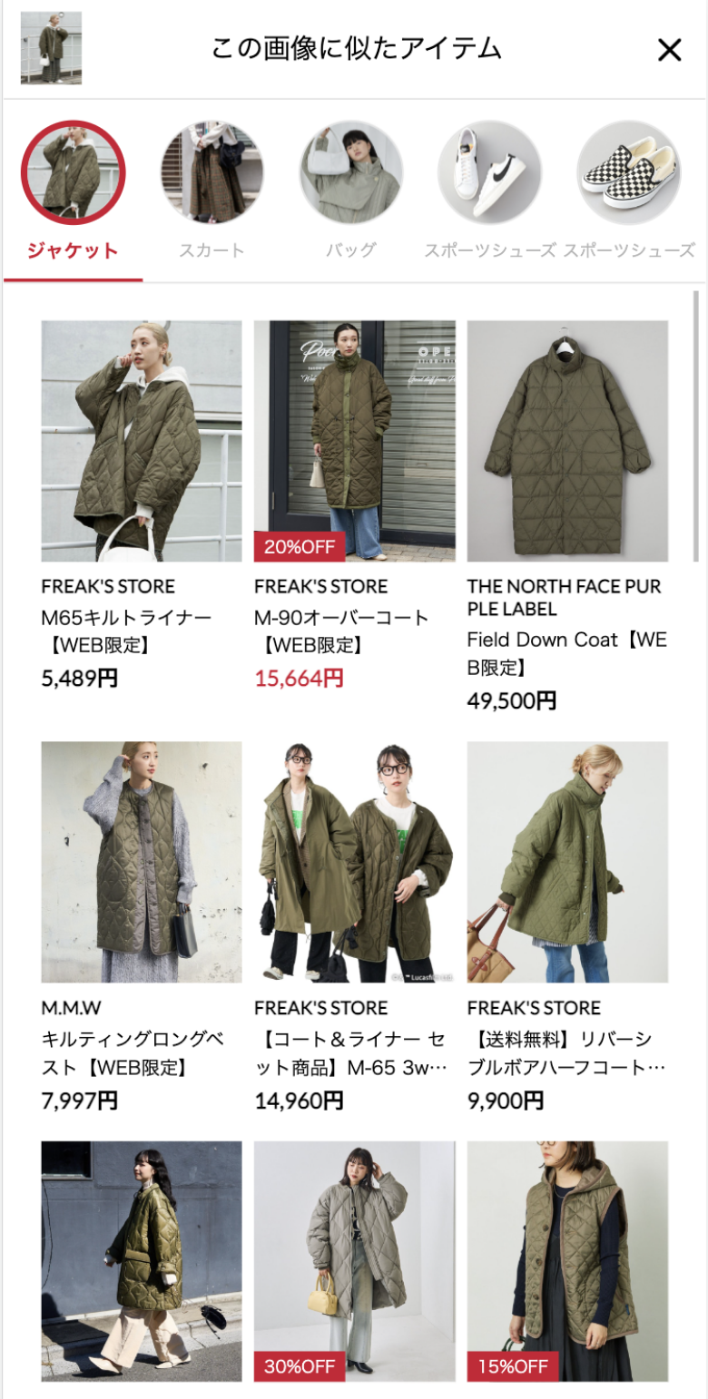 お客様の手元にある写真から検索、類似商品を探すことが可能になりました。これによりSNS等で見かけて気になったアイテムの類似商品を簡単に探すことができます。
