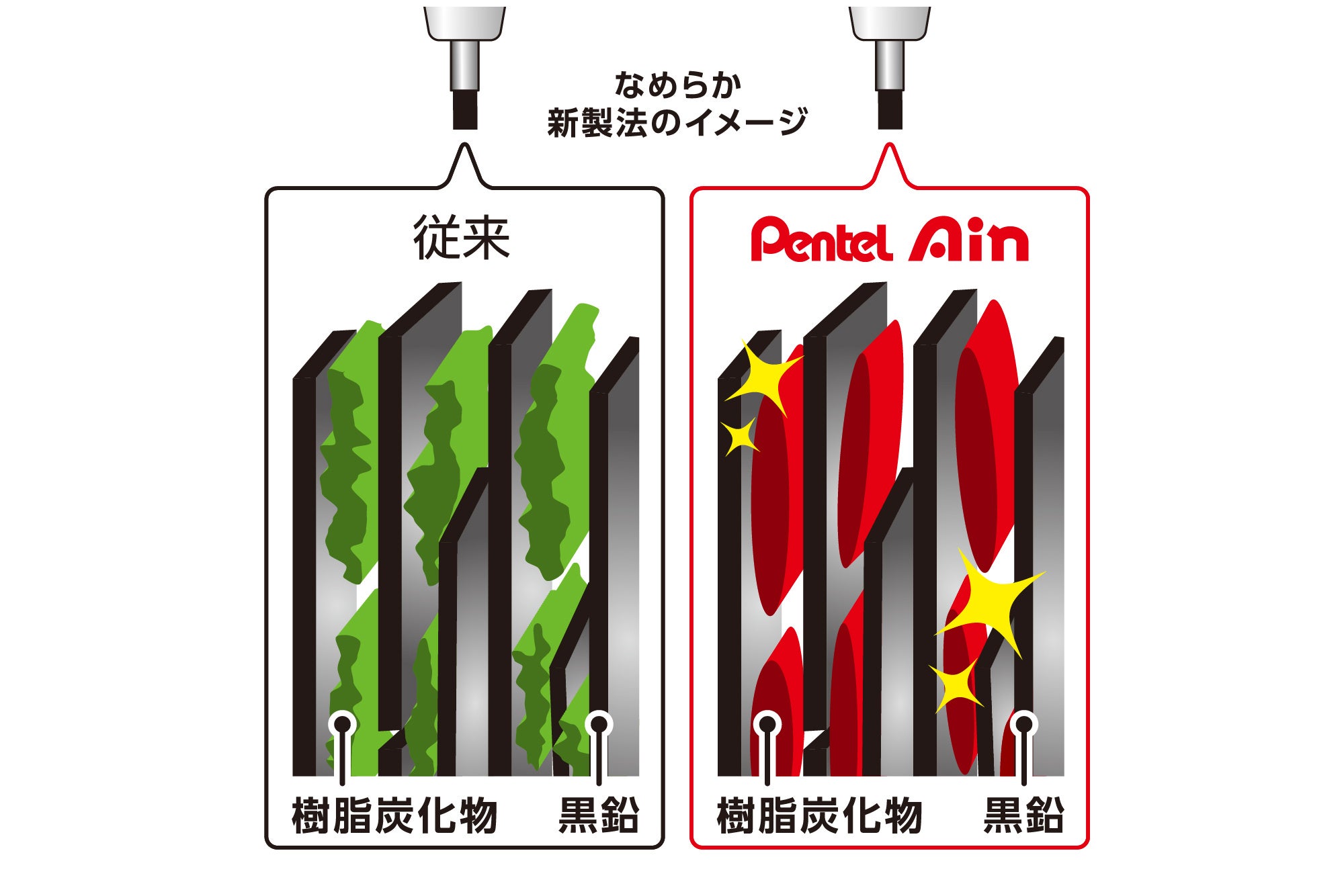 新製品「Pentel Ain」では、原材料に特殊なオイルを使用する新製法により、筆記時には黒鉛と樹脂炭化物がスムーズに崩れるため、なめらかな筆記感を実現しています。
