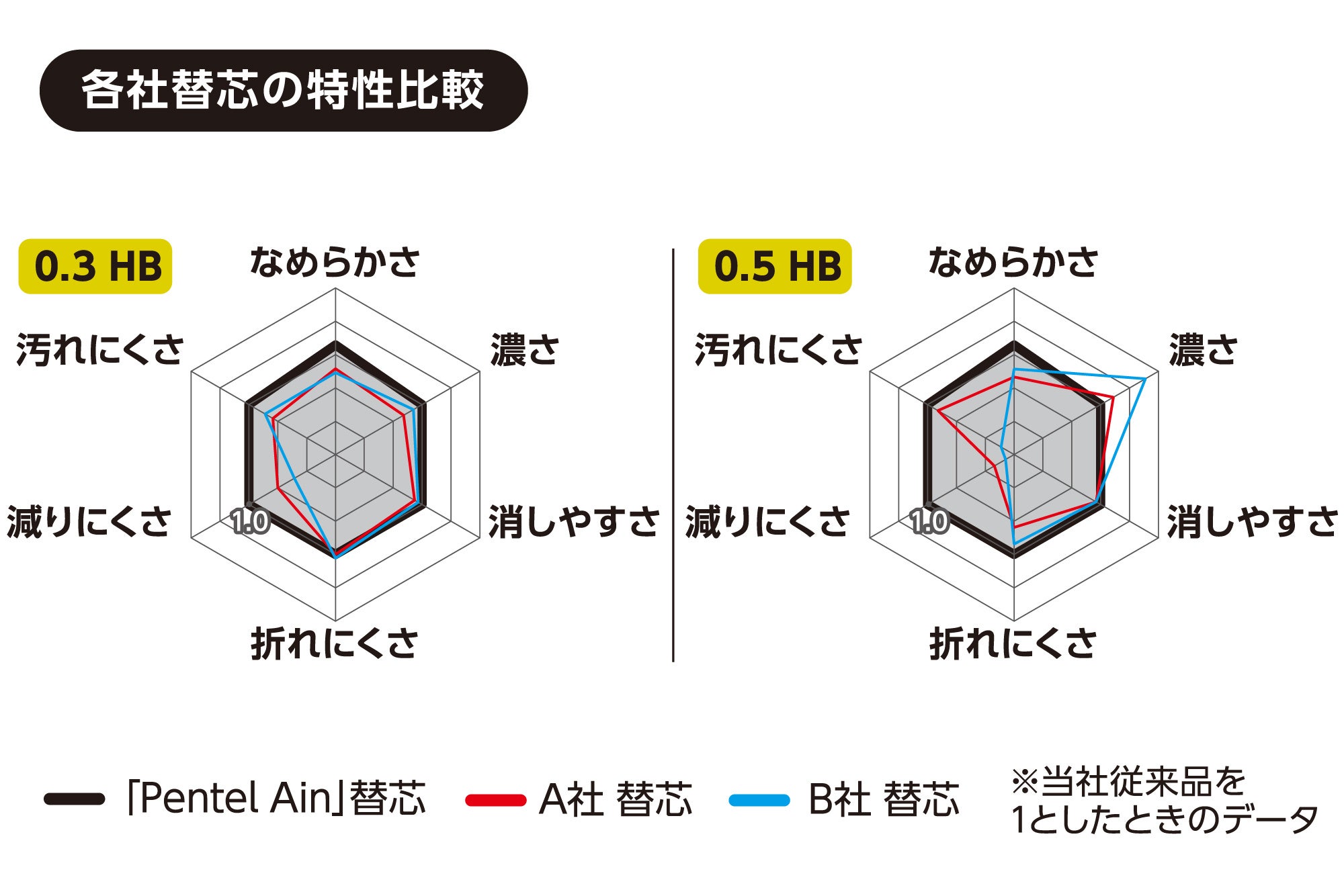 一般的には、シャープペン替芯の性能項目である「なめらかさ・折れにくさ・濃さ・消しやすさ・汚れにくさ・減りにくさ」はひとつの特性を伸ばせば、他の部分の特性が落ちてしまいます。「Pentel Ain」では、これらすべての項目が高次元でバランスよく、高性能を実現しています。