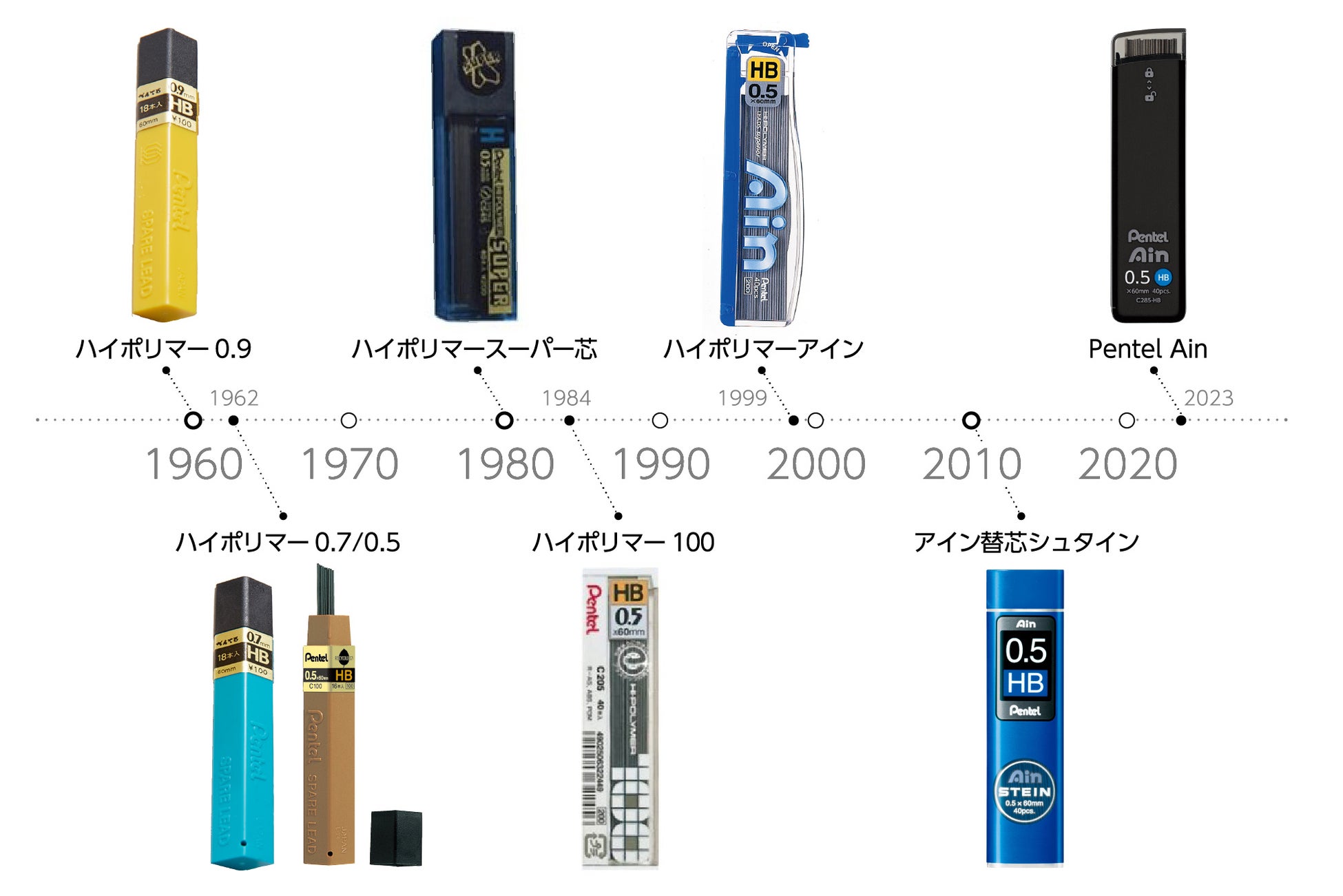それまでのシャープペン替芯は1~1.5mmの太く折れやすい芯しかなく、シャープペンもペンの後端を回して芯を出す「繰出式」が主流でした。ぺんてるが発売した合成樹脂配合芯「ハイポリマー芯」(0.9mm)の登場は、結果として芯を削る必要がなく片手で効率よく芯を出せるノック式シャープペンを生み出しました。これらの替芯とシャープペンの進化は、「ハイポリマー芯(0.5mm)」発売を機にシャープペンの爆発的普及へとつながっていきました。