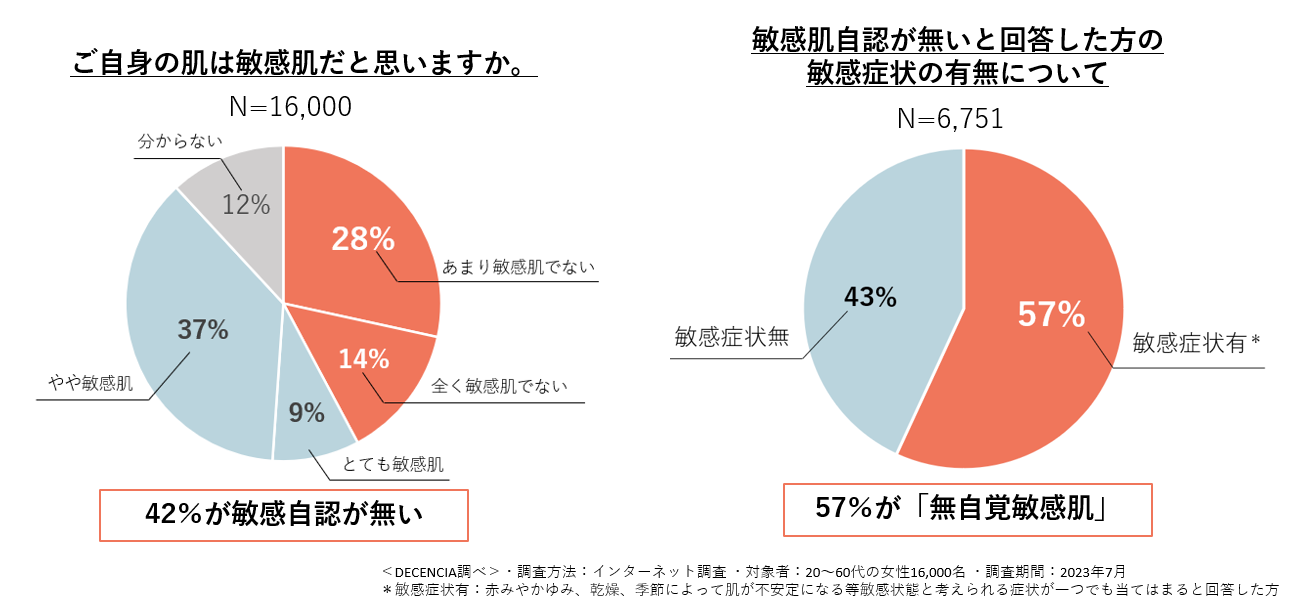 ポーラ・オルビスグループの株式会社DECENCIA(東京都品川区、代表取締役:山口裕絵)が実施した調査の結果、敏感と考えられる肌不調を実感しながらも「自分は敏感肌ではない」と思っている「無自覚敏感肌層」は57%と敏感肌に対しての認識がない方が多いことが分かりました。