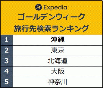 エクスペディアにて、2021年12月1日から2022年2月15日の間に検索されたゴールデンウィーク期間(2022年4月26日から5月9日)の旅行で**、最も検索されている旅行先は「沖縄」でした。昨年に引き続き2年連続で人気No.1となっています。そのほかに人気があったのは、「東京」、「北海道」、「大阪」であり、定番の国内旅行先がランクインしています。海外旅行に対してはまだ慎重姿勢のようで、トップ5はすべて国内旅行先となりました。