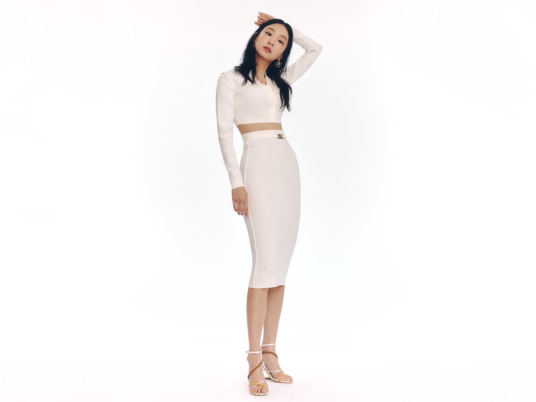 今回の就任と同時に発表されたビジュアルでは、2022年春夏ウィメンズコレクションのホワイトビスコースカーディガンとペンシルスカートのセットアップを着用。アイコニックな新作の「ピーカブー アイシーユー プチ(Peekaboo ISeeU Petite)」と「マイクロ ピーカブー(Micro Peekaboo)」、「FF」ロゴをエンボス加工であしらった「バゲット(Baguette)」を合わせて、若さあふれるエフォートレスなミレニアルスタイルを披露しています。