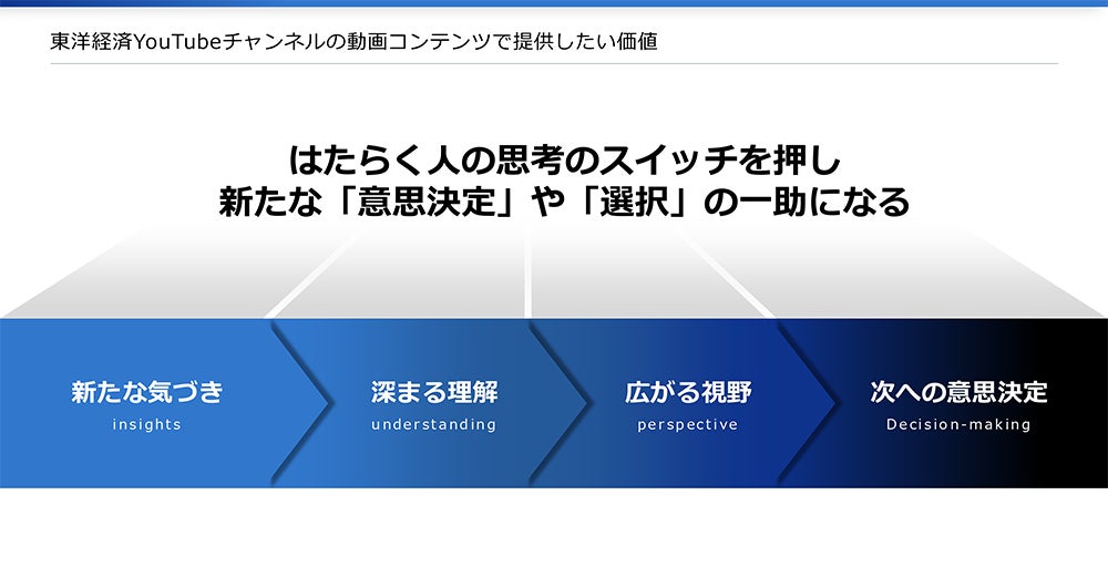 働く人の思考を刺激し、新たな意思決定や選択を支援する情報を提供することを目的に、専門家や記者による産業・企業・経済・政治などの解説、有識者や経営者へのインタビュー、本格的なドキュメンタリーなど、月に約20本の動画を更新しています。