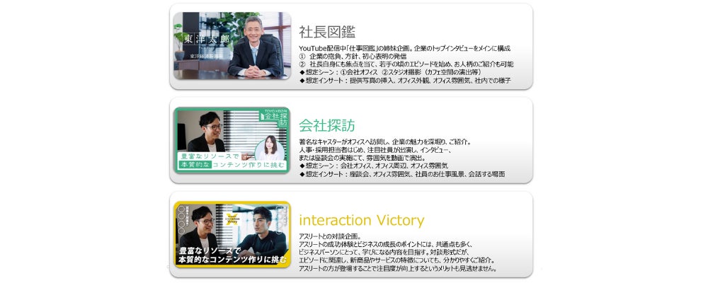 現在、「社長インタビュー」を中心に据えた「社長図鑑」、著名なキャスターが企業を訪問する「会社探訪」、著名アスリートとの対談企画「interaction victory」を提供しています。