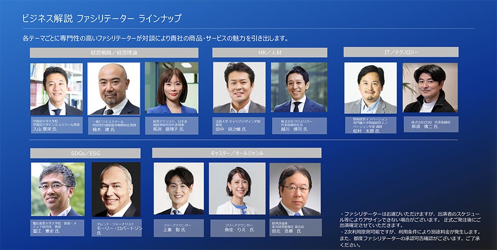 「ビジネス解説」では、「ニュース解説」と同じスタジオとフォーマットを使用し、視聴者に自然に見ていただける動画に仕上げます。ファシリテーターと企業担当者との対談を通じて、企業様のサービスをわかりやすく伝えます。