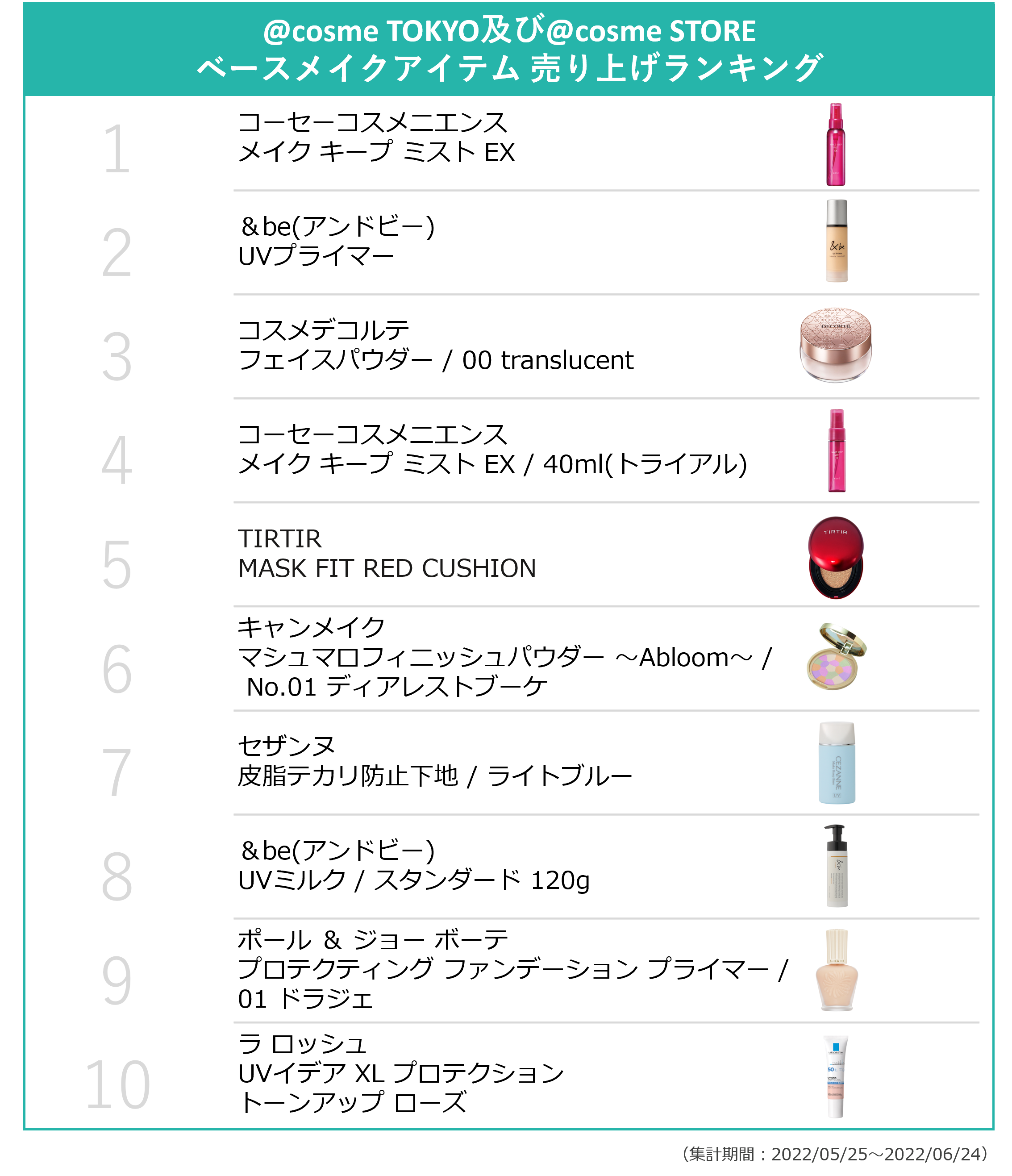 すでに暑い日が続く今、外出時に気になるのは、汗や皮脂によるベースメイクの崩れ。そこで、今回は@cosme TOKYO及び@cosme STORE全館のベースメイクアイテムの売り上げランキングを紹介いたします。1位にランクインしたのは、ファンデーションやフェイスパウダーでもなく、化粧くずれを防ぐミストスプレー!同商品のトライアルサイズも4位にランクインしています。ウォータープルーフ効果、皮脂くずれ防止効果に加えて、マスク着用によるメイクのヨレ防止し、マスクにメイクが付きにくくなるなど、この夏にぴったりな商品です。その他には皮脂のテカリを防止してくれる化粧下地や”最大72時間維持するファンデーション”と謡ったクッションファンデがランクイン。また、ミストスプレーと3位のフェイスパウダー以外は、すべてUV効果のある商品がランクインしているなど、夏の要素が反映されたランキング結果となりました。