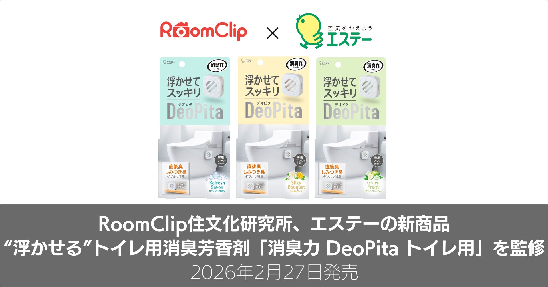 ルームクリップ株式会社(本社:東京都渋谷区、代表取締役社長:髙重正彦、以下ルームクリップ)が運営する「RoomClip住文化研究所」は、エステー株式会社(本社:東京都新宿区、代表執行役社長:上月洋、以下 エステー)が2026年2月27日より発売開始する“浮かせる”トイレ用消臭芳香剤「消臭力 DeoPita トイレ用」の監修を行いました。本取り組みにおいて、RoomClip住文化研究所は、600万枚以上の膨大な投稿データからトイレ空間のトレンドを分析。生活者の潜在ニーズをデータで裏付け、コンセプト立案のための支援を全面的に行いました。ルームクリップは「人と人、人と企業が繋がる住生活の新しい産業と文化を築く」というビジョンの実現に向け、RoomClipに蓄積したデータや生活者のインサイトを活用した、住生活領域の企業様の商品開発やマーケティング支援を幅広く行なって参ります。
