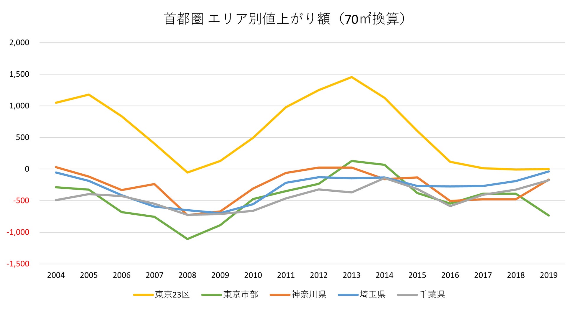 ・高級住宅地を多く抱える港区、千代田区、渋谷区の中古値上がり額が特に高い