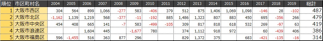 ・大阪府では大阪市西区、北区、中央区、浪速区、福島区と大阪市内中心部が上位を占めた