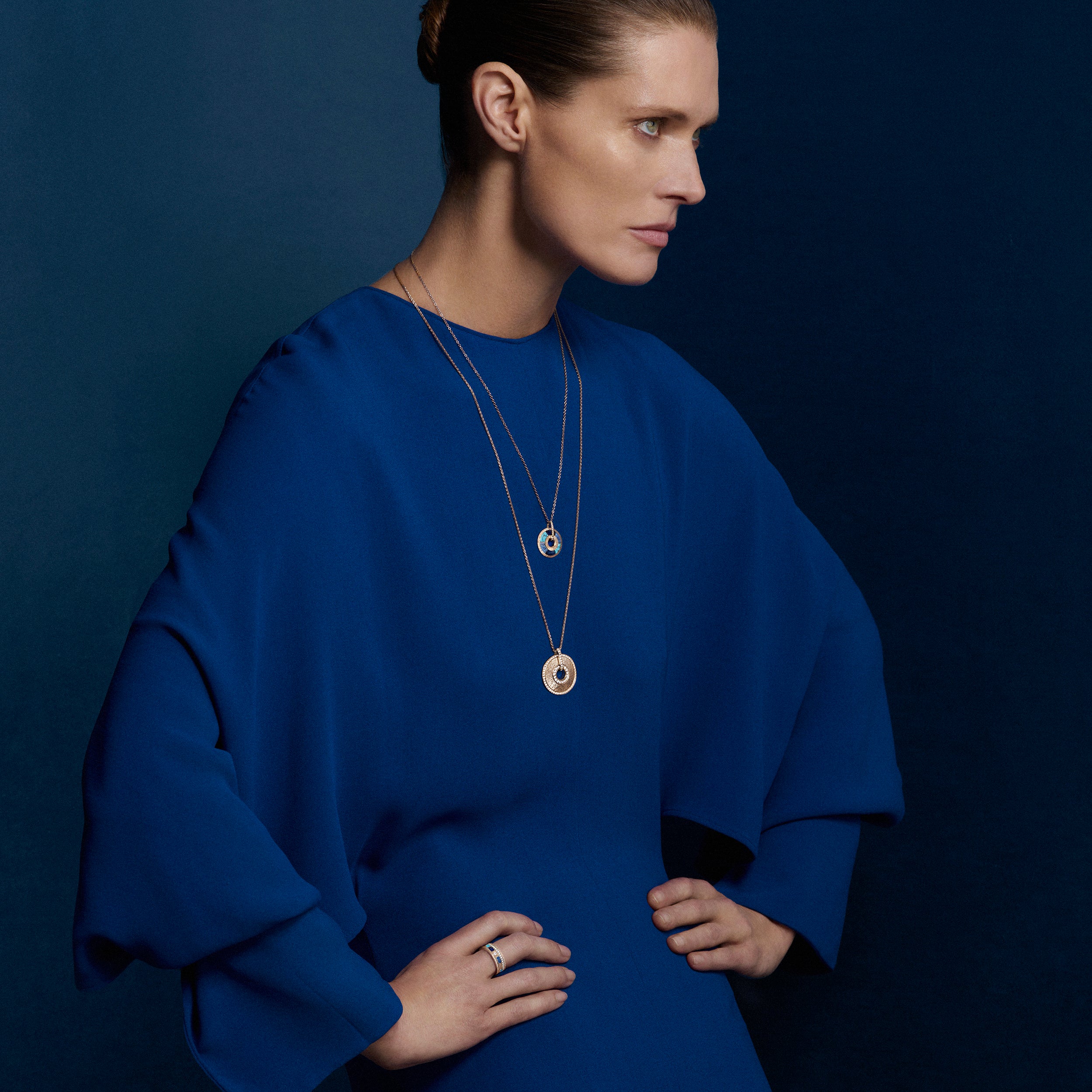 ポセションの放つ陶酔の魅力はその動きにあります。ピアジェ独自の喜びに満ちた快楽主義の精神を体現し、身に着ける人の直感に従い、格調高く優雅に瞬間を捉えるよう促しています。渦巻くブルーで華やぐ象徴的な回転が、美の新しいフォルムを探求します。色彩溢れるファセットが囲むリング、ブレスレット、メダリオンはどれも大切なサポート役となり、普段使いのジュエリーとしても、フォーマルな装いにも、一人ひとりの個性を際立たせます。それぞれの作品は、感情が自由に流れ、世界を開き、明日の希望を輝かせ、今の瞬間を豊かにする記憶への秘密の通路を形成します。
