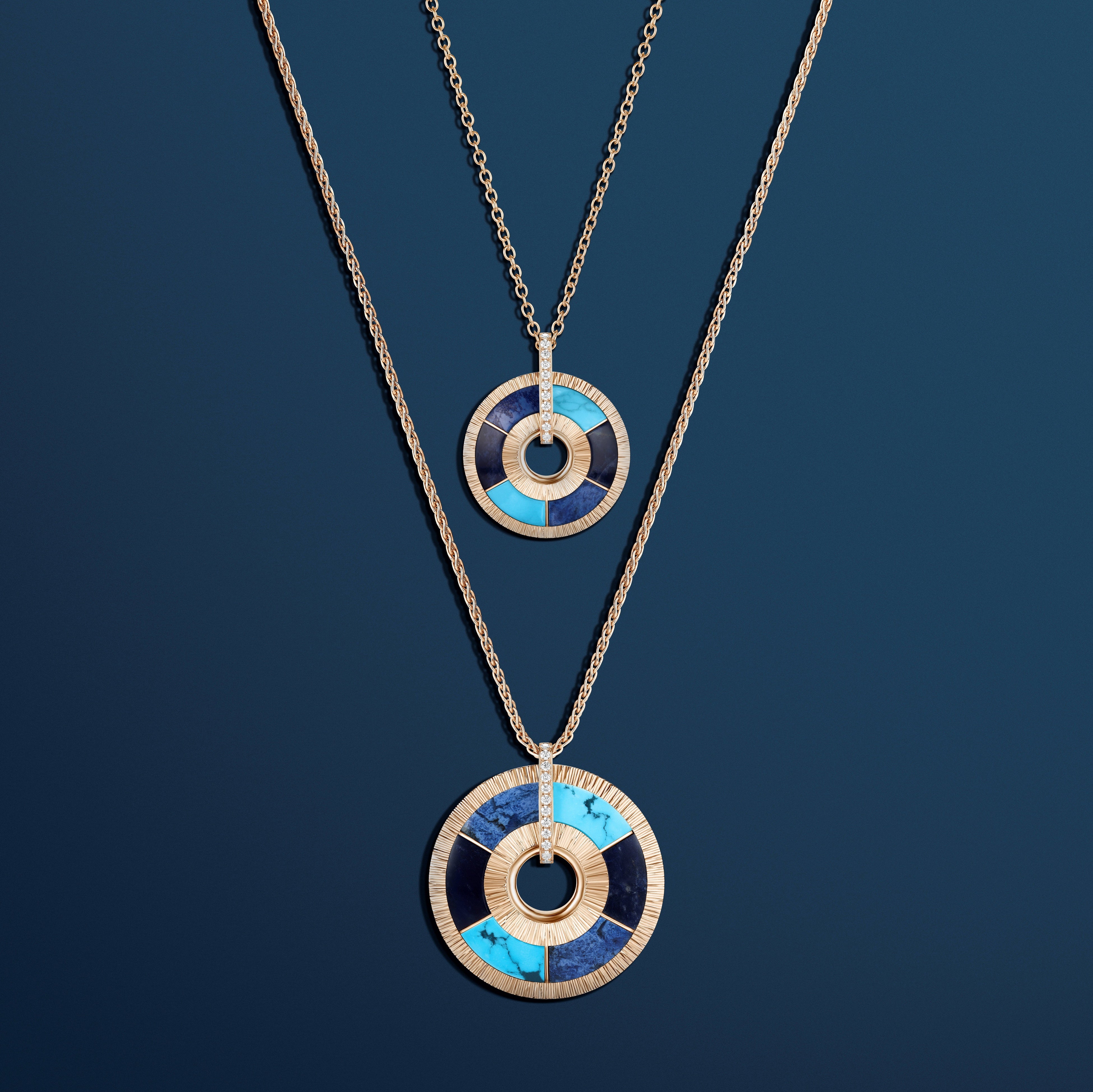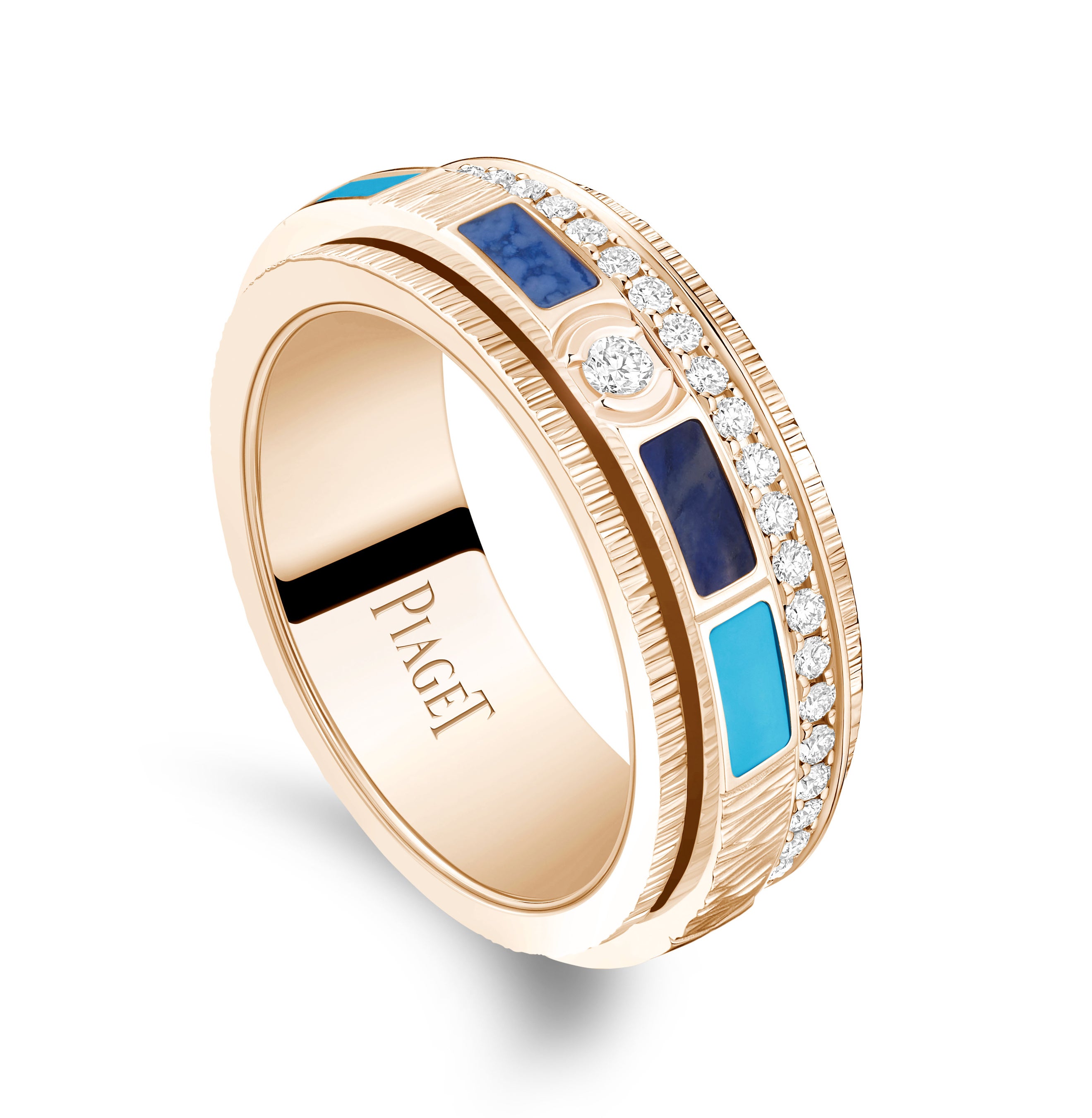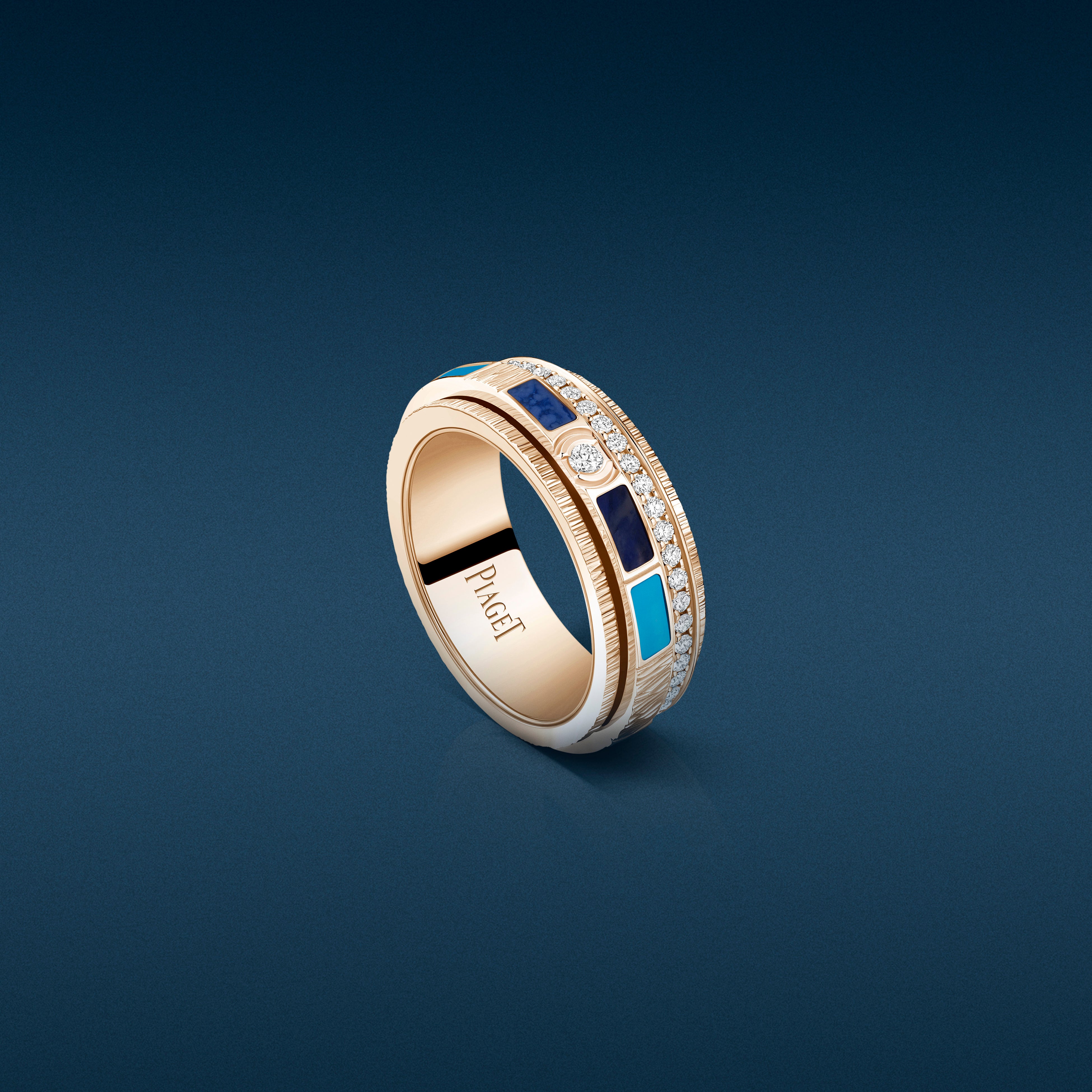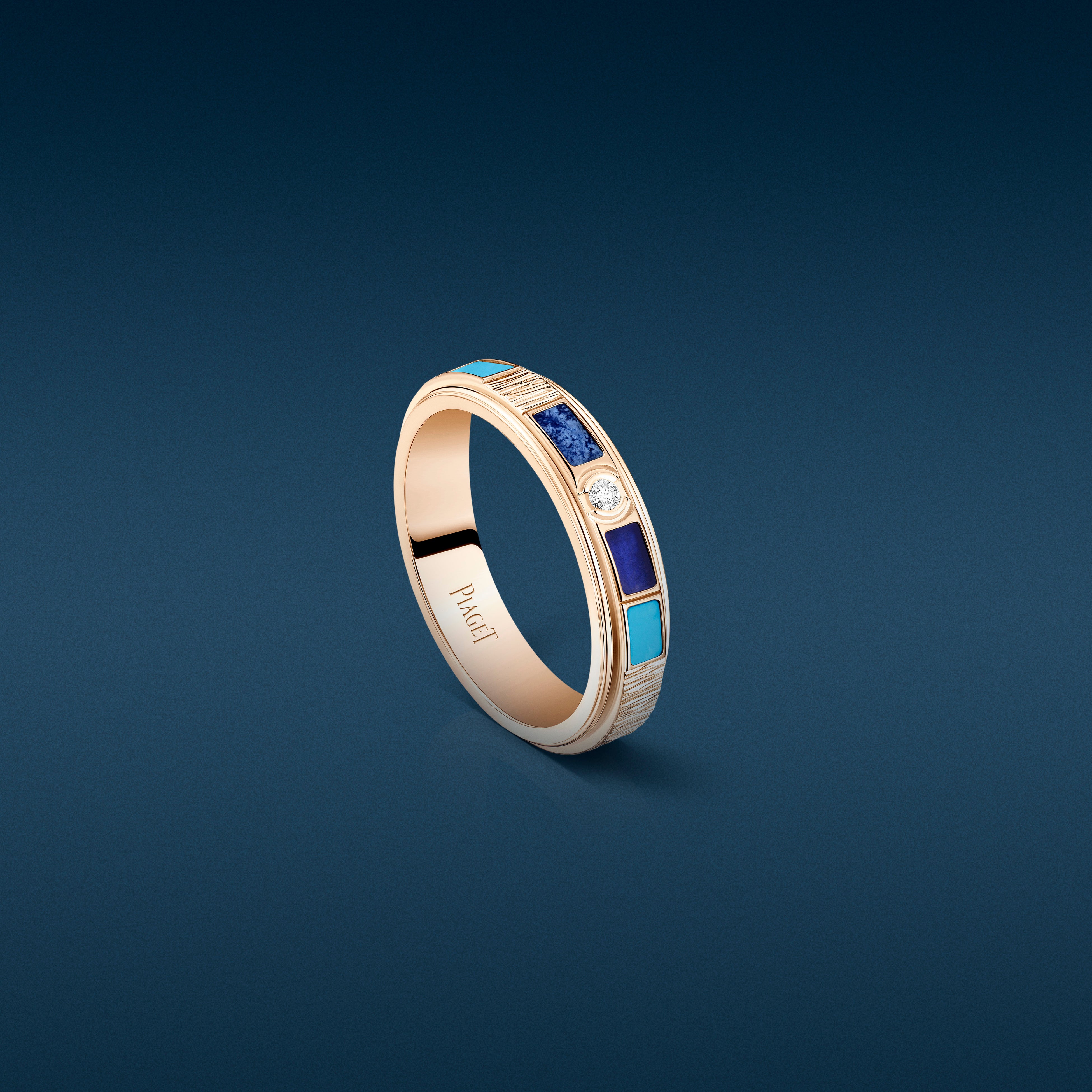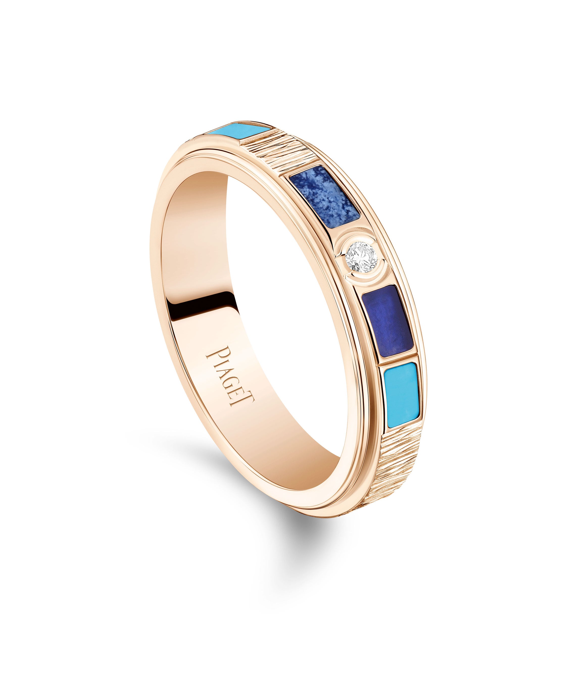 ポセション バイブラント パレスが新たな次元を呼び覚まします。詩的かつ雄弁な作品が豊富に揃ったこのコレクションは、パレス装飾のゴールドエングレービングの特徴と魅惑的なオーナメンタルストーンを組み合わせた、見事なハードストーン モザイクを導入しています。ピンクゴールドの輝き、磨き上げられたゴドロン、ハーフムーンセットのダイヤモンド、カラーストーンを組み合わせた貴重なディテールが際立ち、軽やかでありながらグラフィカルな形状を基調とした非対称性を表現しています。メゾンの長年にわたるサヴォアフェールに由来するそれぞれの石は唯一無二であり、それぞれのジュエリーを特別なものにしています。これらの生きた傑作では、石の質感、正方形や楕円形の多様なニュアンスの深さ、光の共鳴が絡み合い、絵画のように鮮やかで動きのあるコントラストを描きます。精巧にカットされた繊細なターコイズ、紺碧のソーダライト、そして魅力的なデュモルチェライトが、陶酔させるようなモザイクの中で調和して、作品を護符の地位に引き上げています。それぞれが、太古の昔から人々の想像力を魅了してきたお守りに呼応し、そのビジョンを蘇らせることで、ピアジェはジュエリーを守護石へと変貌させます。コレクションの美学は象徴性を親密に伝え、それぞれの輝くジュエリーに深い意味を込めています。多くの文化において繁栄と幸運の普遍的な象徴である環状のフォルムは、本質的に守護的な側面を持っています。