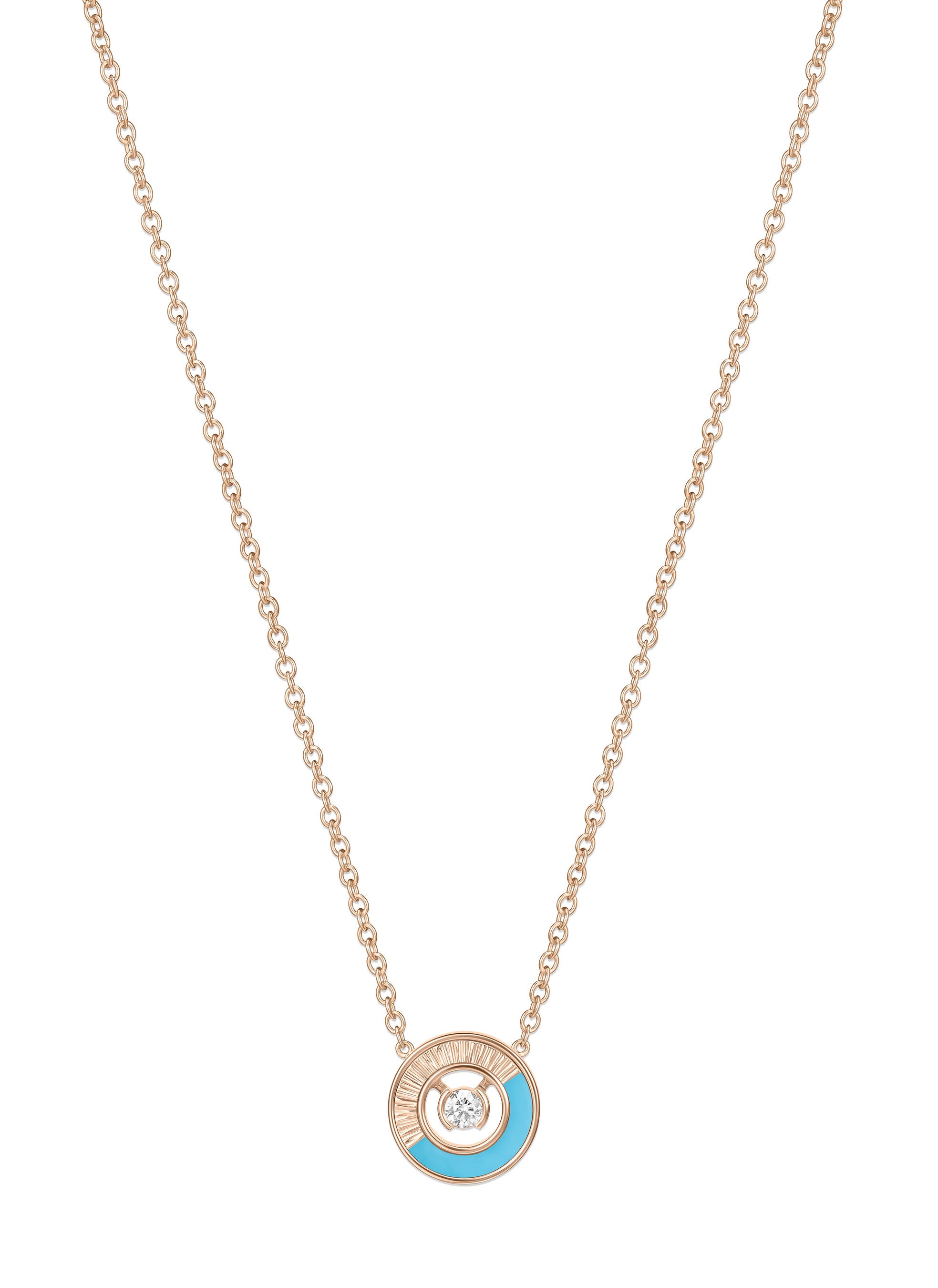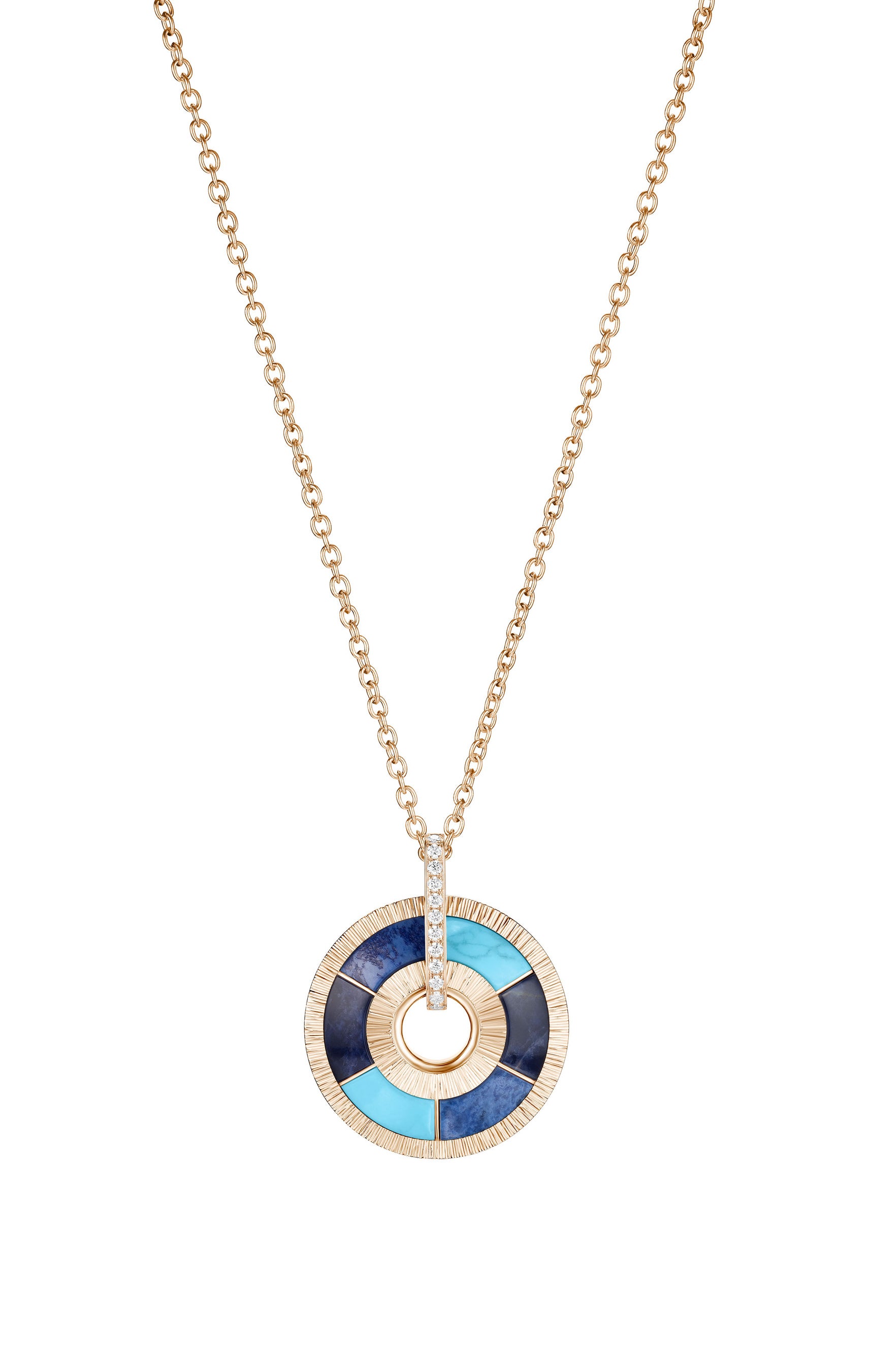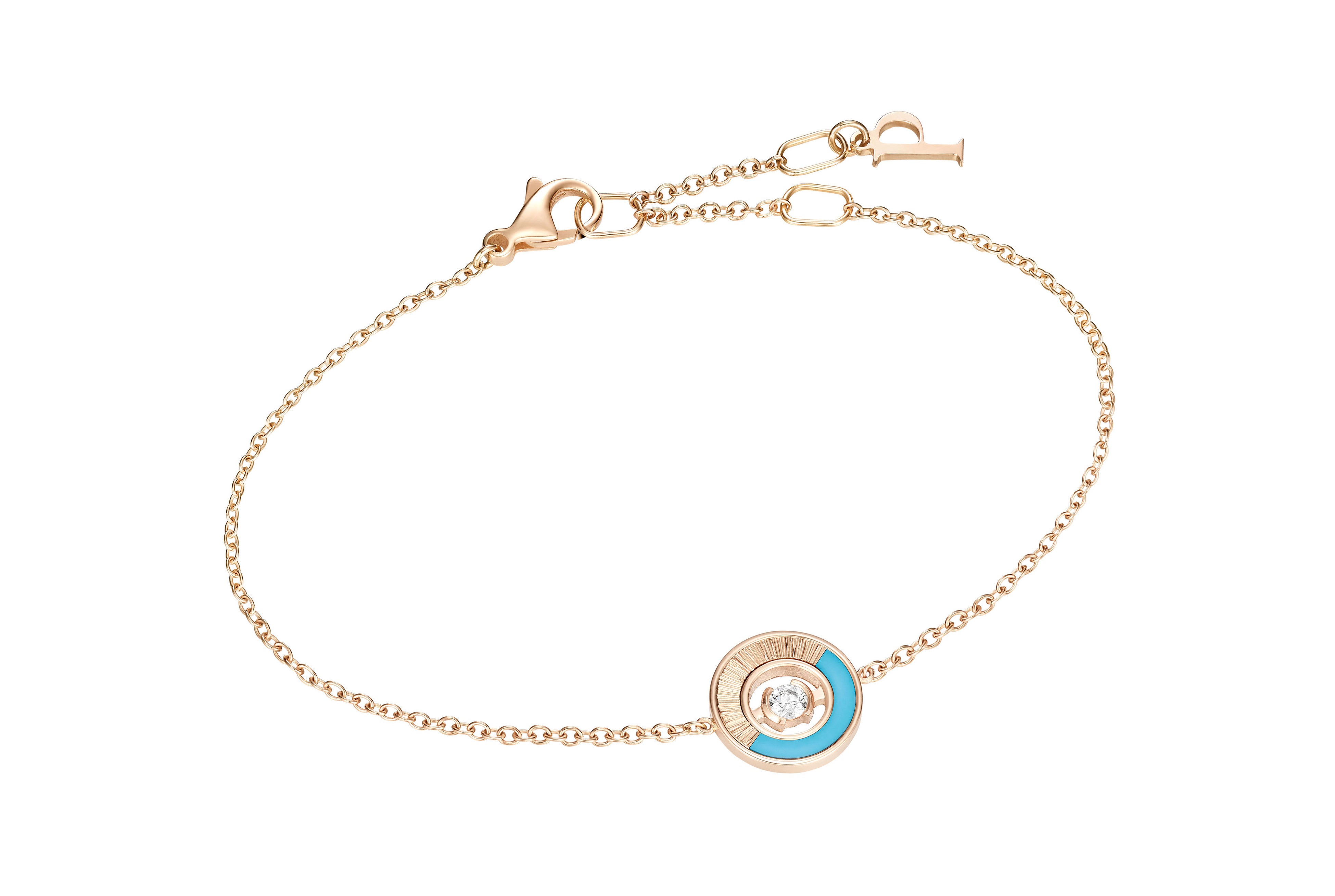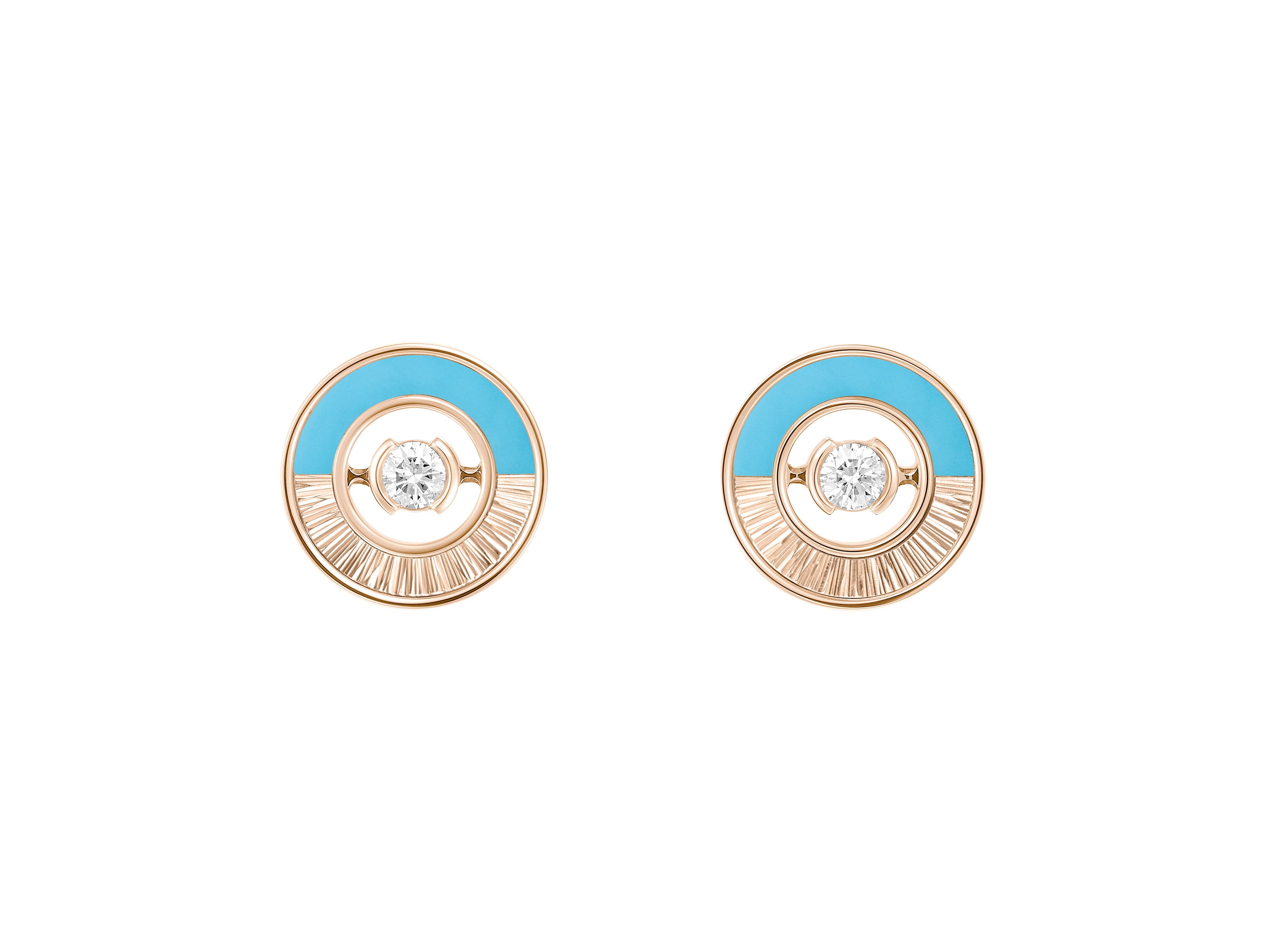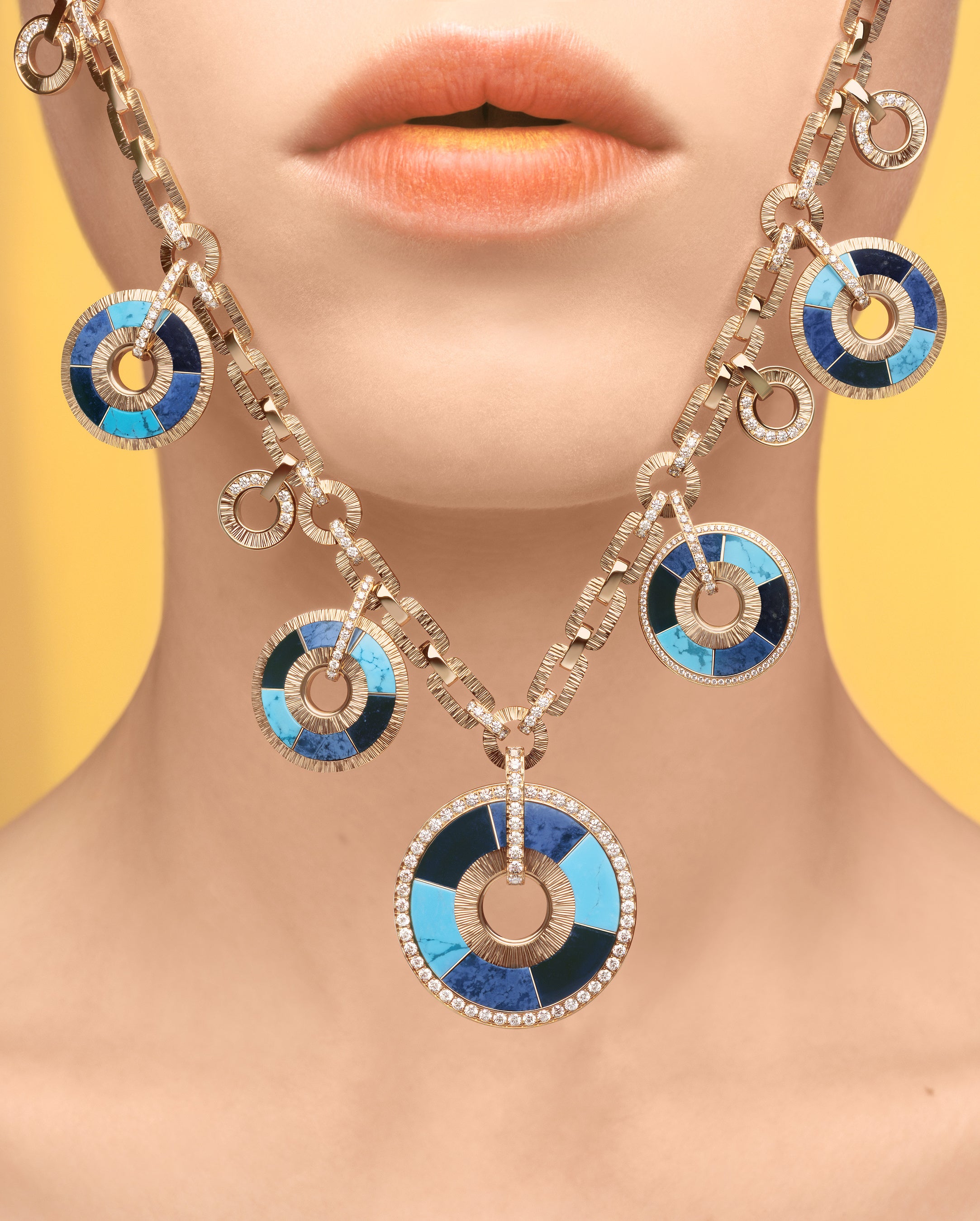 ポセション バイブラント パレスが新たな次元を呼び覚まします。詩的かつ雄弁な作品が豊富に揃ったこのコレクションは、パレス装飾のゴールドエングレービングの特徴と魅惑的なオーナメンタルストーンを組み合わせた、見事なハードストーン モザイクを導入しています。ピンクゴールドの輝き、磨き上げられたゴドロン、ハーフムーンセットのダイヤモンド、カラーストーンを組み合わせた貴重なディテールが際立ち、軽やかでありながらグラフィカルな形状を基調とした非対称性を表現しています。メゾンの長年にわたるサヴォアフェールに由来するそれぞれの石は唯一無二であり、それぞれのジュエリーを特別なものにしています。これらの生きた傑作では、石の質感、正方形や楕円形の多様なニュアンスの深さ、光の共鳴が絡み合い、絵画のように鮮やかで動きのあるコントラストを描きます。精巧にカットされた繊細なターコイズ、紺碧のソーダライト、そして魅力的なデュモルチェライトが、陶酔させるようなモザイクの中で調和して、作品を護符の地位に引き上げています。それぞれが、太古の昔から人々の想像力を魅了してきたお守りに呼応し、そのビジョンを蘇らせることで、ピアジェはジュエリーを守護石へと変貌させます。コレクションの美学は象徴性を親密に伝え、それぞれの輝くジュエリーに深い意味を込めています。多くの文化において繁栄と幸運の普遍的な象徴である環状のフォルムは、本質的に守護的な側面を持っています。