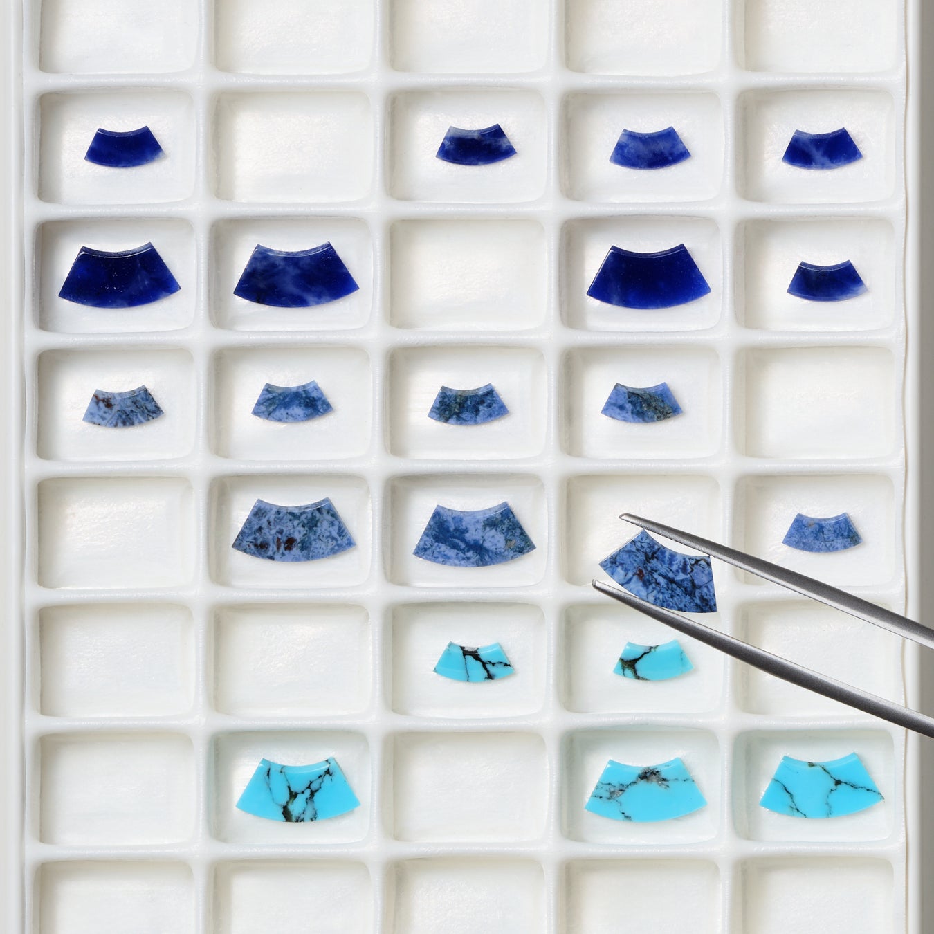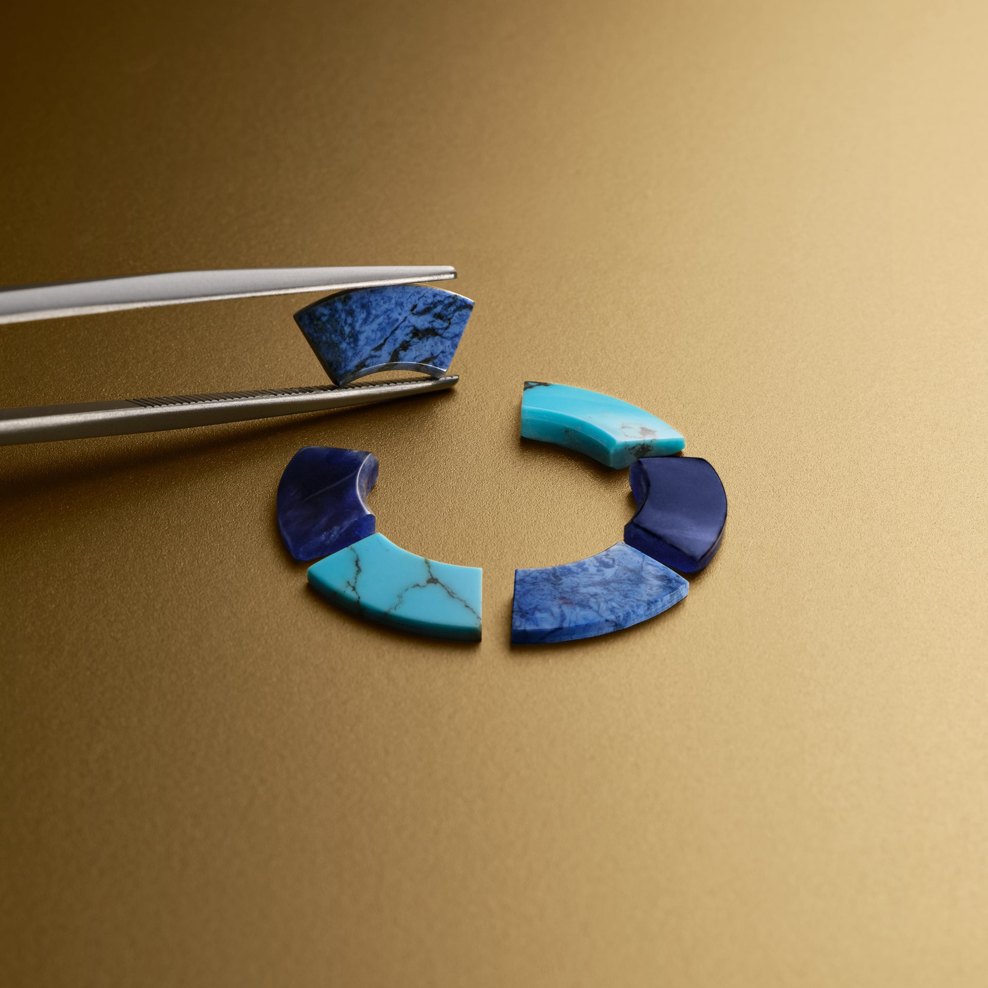 ピアジェにおいて、それぞれの色合いは素材であり、素材とは何よりも色の問題です。ブルーは、そのサヴォアフェールによる最も象徴的な作品を体現しています。歴史を通じて、それら作品は多元的な範囲に広がる独特の色調で変化してきました。ピアジェ ブルーは受け継がれるべきレガシーであり、伝統と未来を密接に結びつけるものです。この鉱物的な性質が、素材に生命を吹き込みます。ターコイズの明るい輝きが、ソーダライトとデュモルチェライトの深みと調和します。これら3つの石が一体となり、身に着ける人に無限の可能性をもたらします。