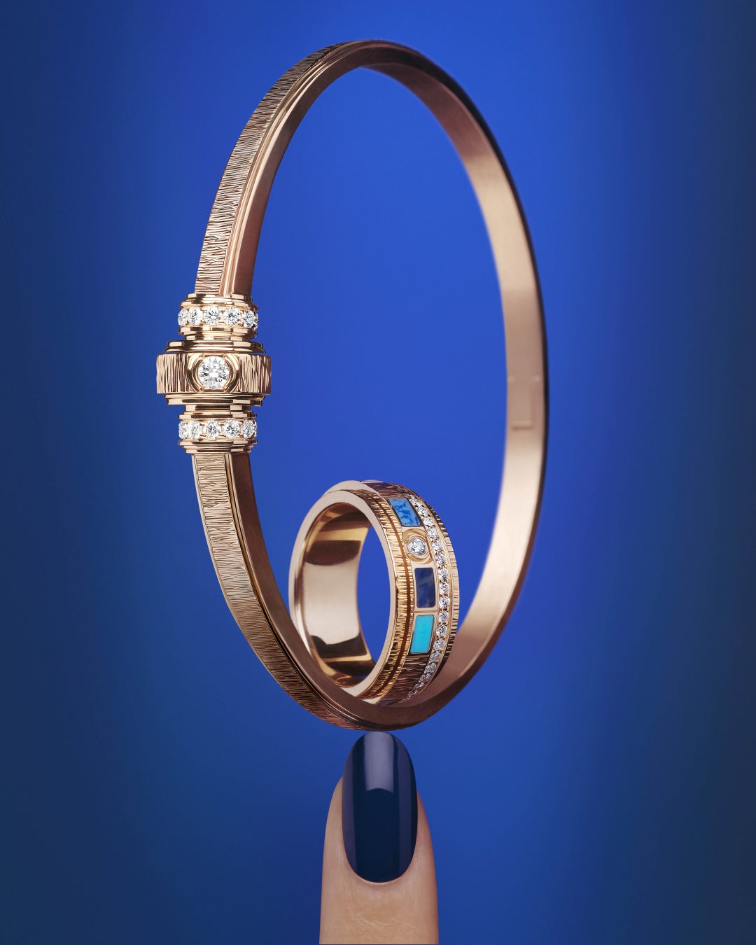 1990年に発表された最初のポセションリングは、ゴールド、デザイン、そして環状の動きのつながりを再構築し、ピアジェの歴史に転換点をもたらしました。それ以来、ポセションはフォルム、素材、光を操りながら進化し、豊かに成長しています。ポセションポップやデコ パレス(パレス装飾)コレクションは、メゾンの想像力と職人技伝統の影響を強めました。この新しいコレクションで、ピアジェはポセションの中心にあるクチュールのアイデンティティを再確認しました。回転はコレクションの重要な要素であり、この無限の環状の動きの芸術に新たな次元を加えて、革新をもたらしています。