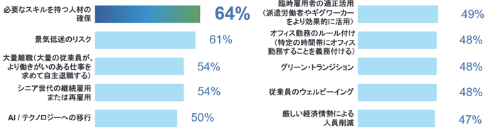 人事戦略の優先事項を計画する際、影響を及ぼす項目として、64%の企業が「必要なスキルを持つ人材の確保」という結果になりました。一方、50%の企業では、「AI/テクノロジーへの移行」を重要な要素としており、スキル人材の確保とあわせて、テクノロジーの活用も重要視されています。