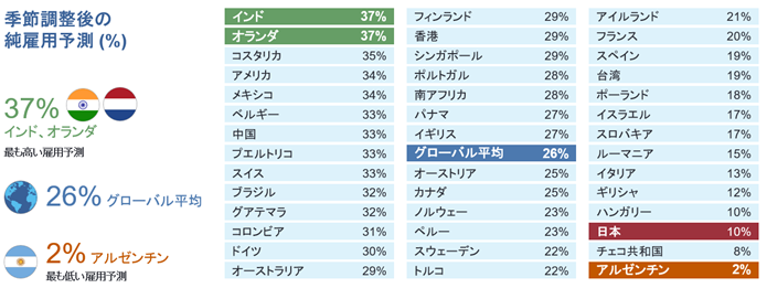 純雇用予測は、41カ国・地域すべてで、プラスと回答しています。世界的に活発な雇用予測がされている中、日本の雇用意欲は、+10%と堅調な予測でした。