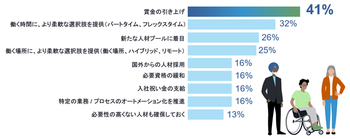 人手不足解消へ向けた対応策として、41%の企業が「賃金の引き上げ」と回答。働く時間帯や場所に柔軟性をもたらすことは、引き続き重要なポイントではあるものの、「賃金の引き上げ」や「新たな人材プールに着目」などの施策も注目が集まっています。