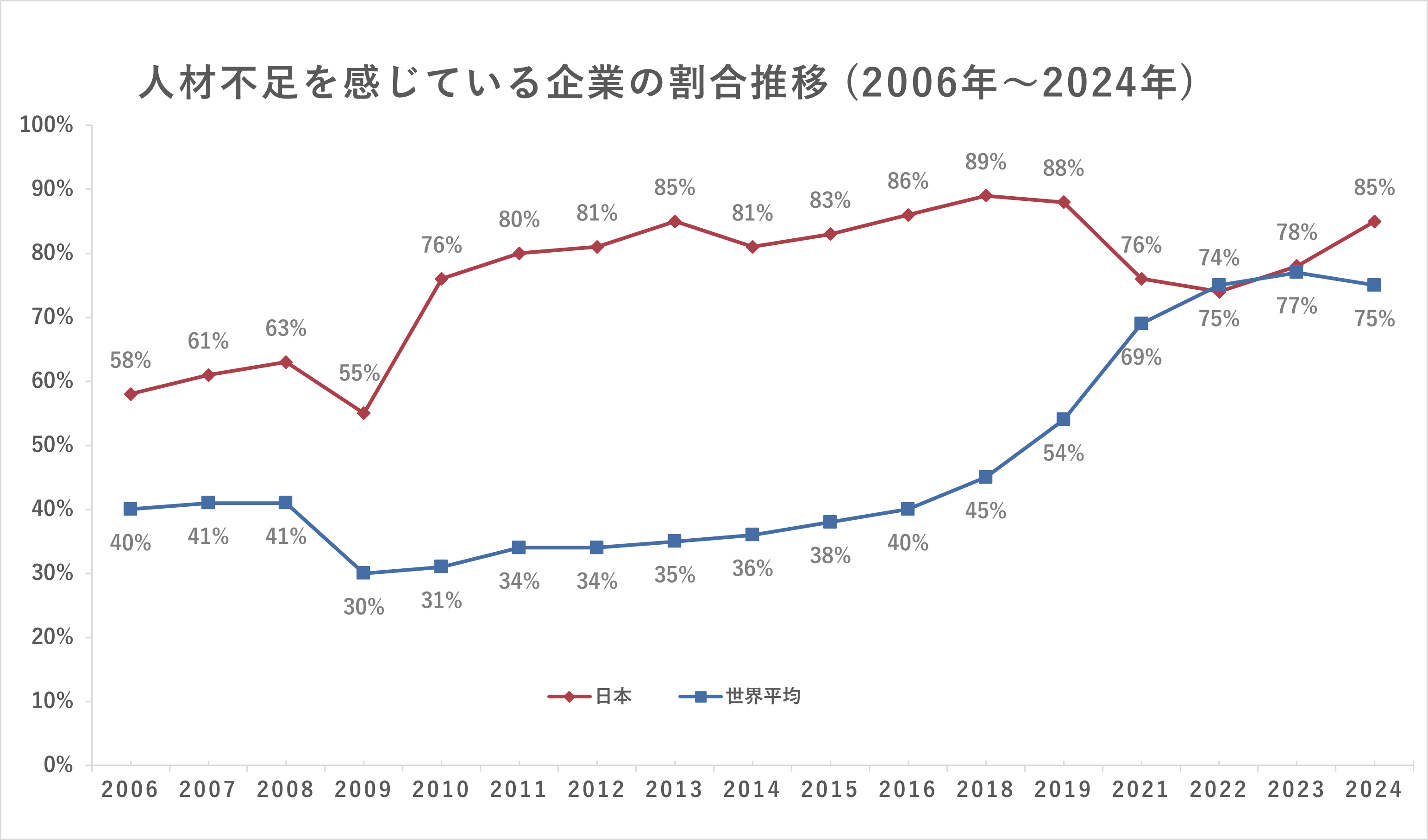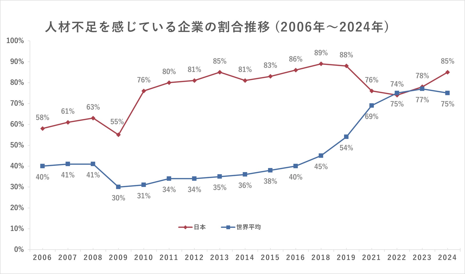 世界で人材不足を感じている雇用主は、前年比2ポイント減少の75%です。日本は、前年比7ポイント増加の85%となり、41ヵ国・地域の中で最も人材の不足感が強い結果となりました。