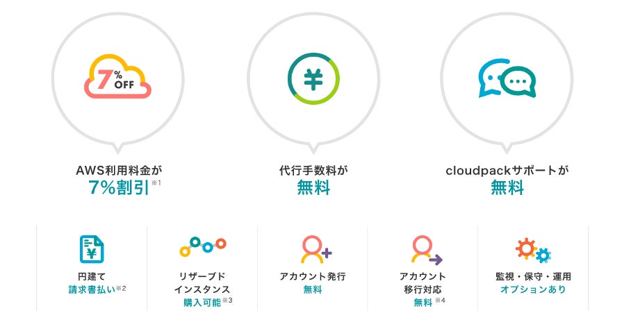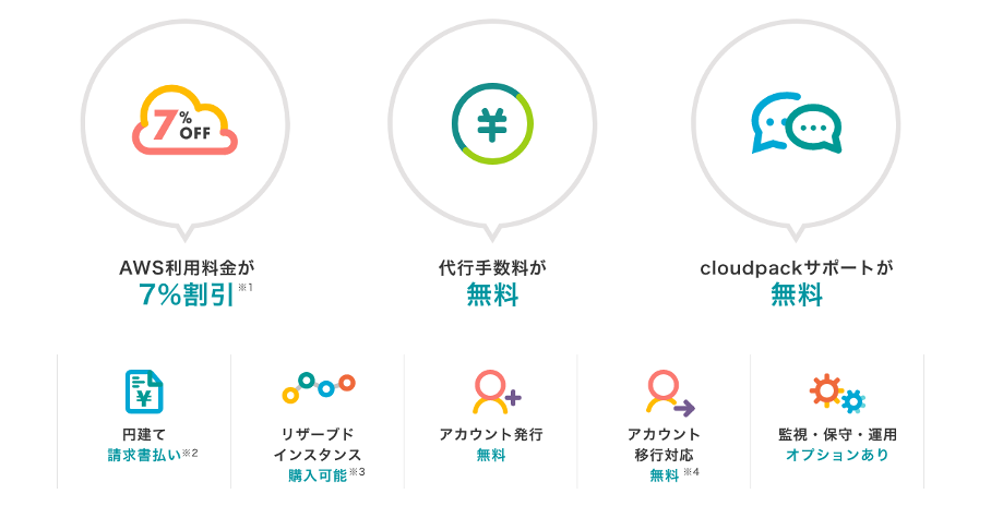 AWS を7%割引でご利用いただけるサービスです。AWS の利用に際し、設定を行なう上での不明点や各種プロダクトの利用方法などで疑問があれば、無料で cloudpack のサポートエンジニアから丁寧なサポートを受けることができます。様々なお客様の AWS 環境に携わってきた「cloudpack」だからこそ持ち得る豊富なノウハウが強みです。
