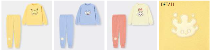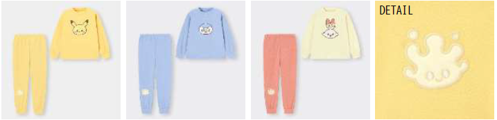 キッズは、寒い冬でもあたたかく過ごせるフリースラウンジセットにピカチュウ、ポッチャマ、ヒバニーをデザインしました。各ポケモンをイメージしたカラーリングと、膝に配したマホミルがポイントです。