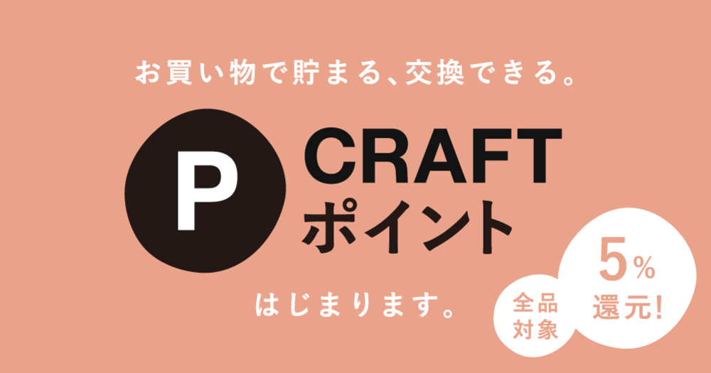 内容:CRAFT STORE内でのお買い物にて、会計金額の通常5%のポイントが獲得予定ポイントとして付与されます。貯まったポイントは販売中の一部アイテムと交換可能です。