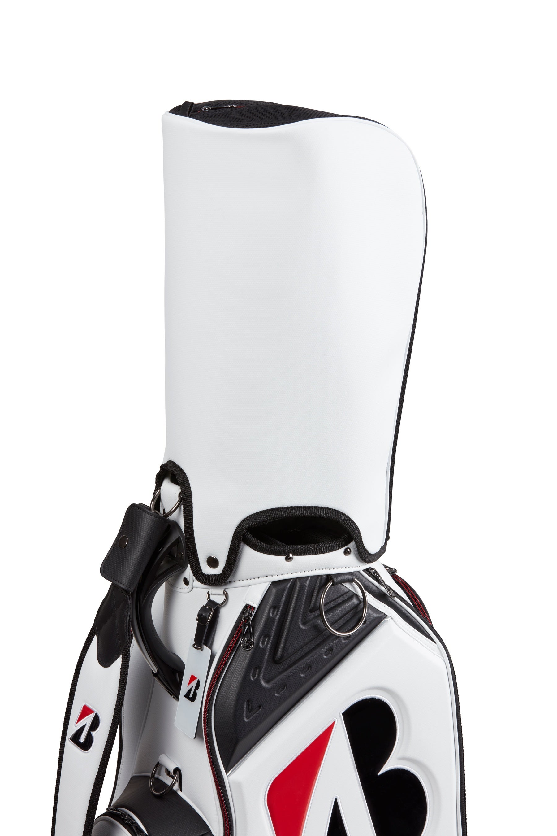 『ツアーレプリカモデル』は、2024年のツアー開幕より当社契約選手が使用を予定しているキャディバッグのレプリカモデルです。バッグ本体の右サイドにはBマーク、左サイドにはブリヂストンゴルフのロゴを大きくあしらった非対称のデザインで、ツアーモデルらしい重厚感のあるキャディバッグです。カラーバリエーションは3色で、当社契約選手の使用色はWK(白/黒)またはBK(黒)です。また、持ち運びに便利な口枠部分のハンドルや、担ぐ際の安定性を確保する3点式のショルダーベルト、便利なグローブホルダーなど、プレーヤーの視点に立った機能が搭載されています。