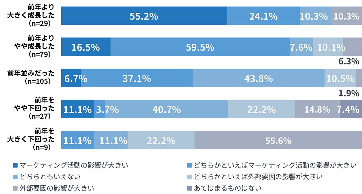 売り上げ成長にはマーケティング活動が大きな影響を与えており、「前年より大きく成長した」と回答した人のうち、55.2%が「マーケティング活動の影響が大きい」と回答。