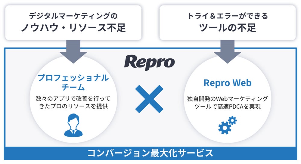 「コンバージョン最大化サービス」は、サイト改修不要で施策を実施できるデジタル接客ツール「Repro Web」と豊富な経験、高いスキルを持ったプロフェッショナルチームをセットで提供し、デジタルマーケティングの2大課題である「人材・ノウハウ」「ツール」の不足を一挙に解決するソリューションです。顧客コミュニケーションの改善と売上拡大を支援します。