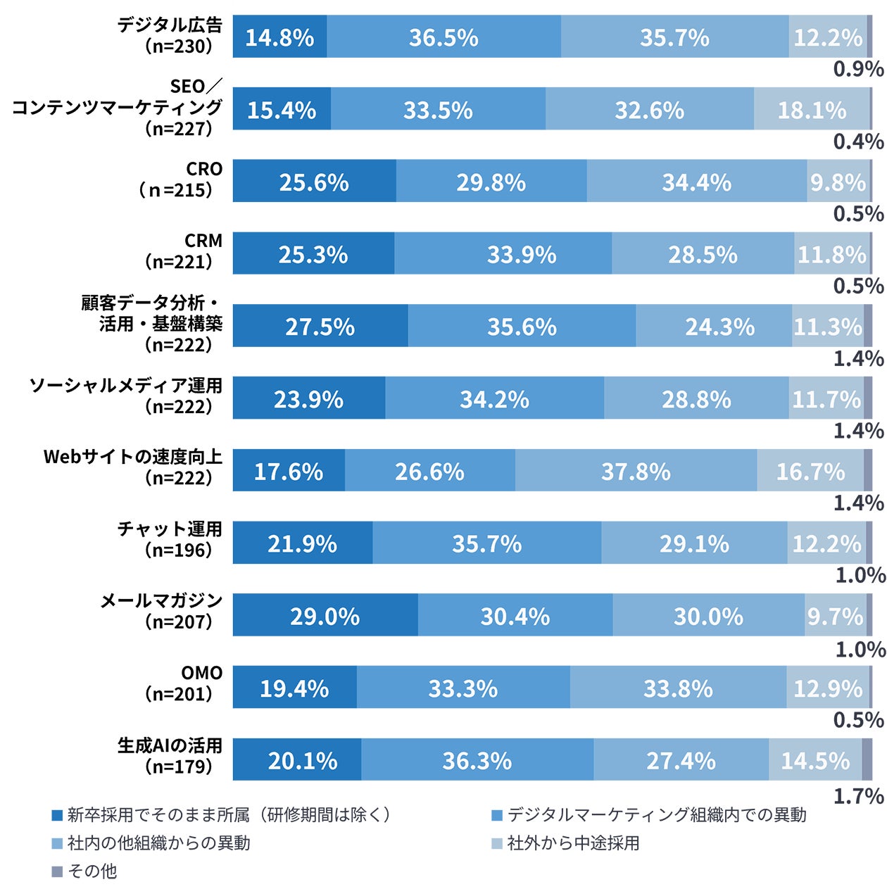各種デジタルマーケティング施策の主たる担当者はプロパー人材に偏る傾向があり、明確に「社外からの中途採用」と回答した人は、どの施策領域においても20%を下回る。
