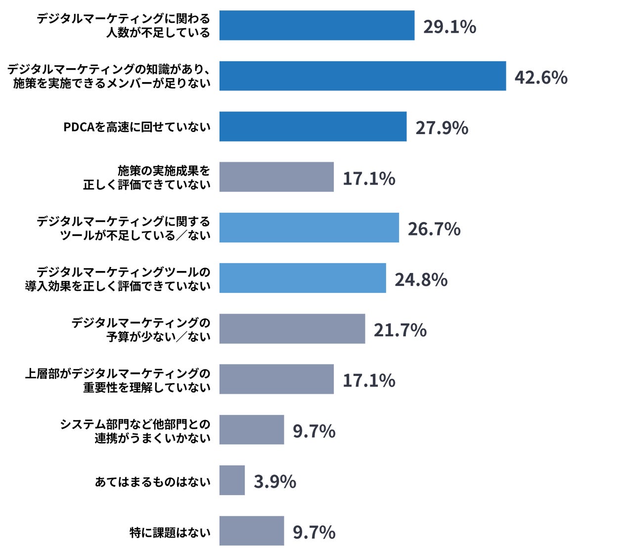 デジタルマーケティングの課題は「人材」「マーケティングツール」に集中。「デジタルマーケティングの知識があり、施策を実施できるメンバーが足りない」が42.6%と、特に知識・ノウハウ不足に対する課題感が強い。