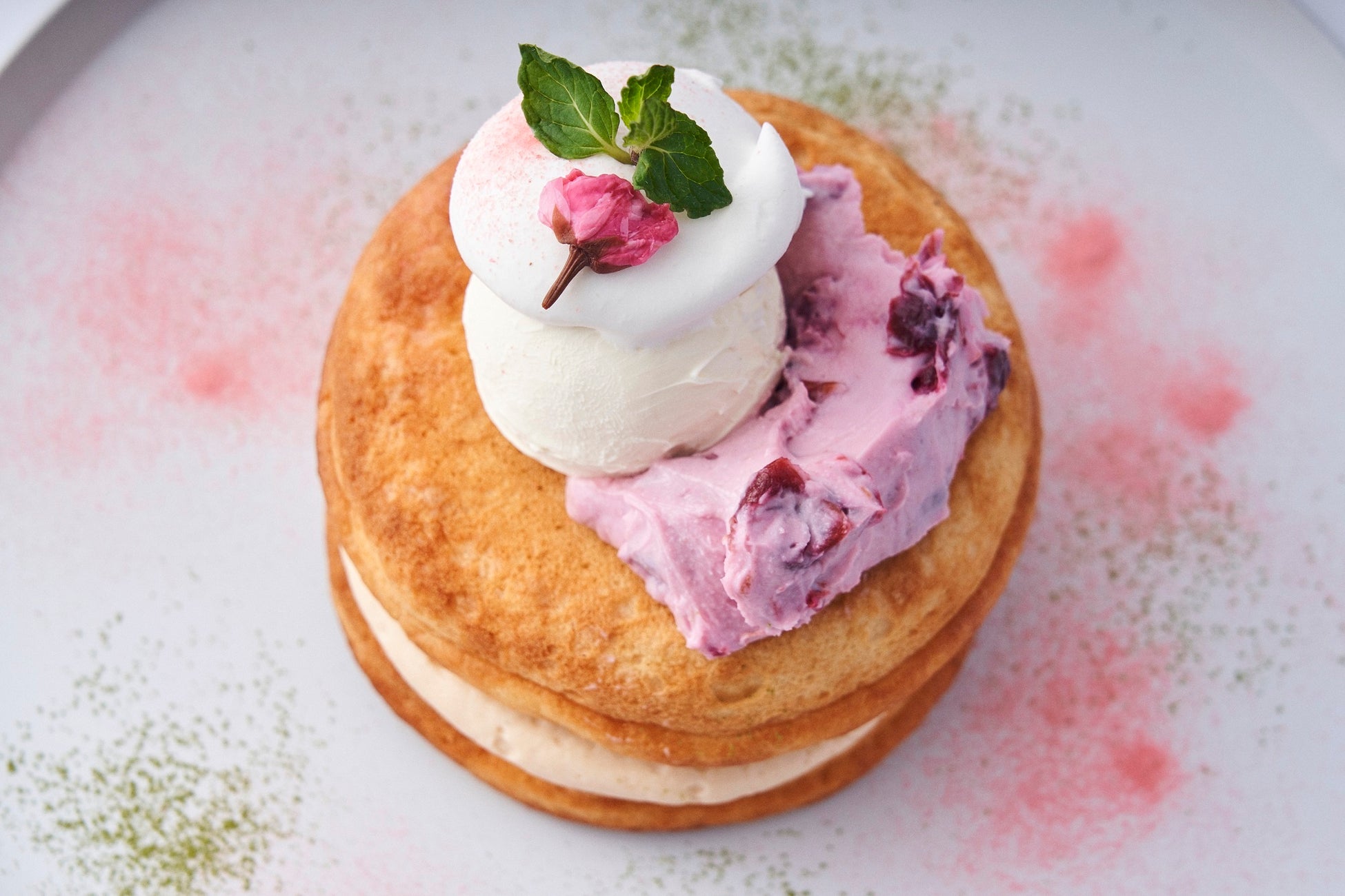 じっくりと煮込んだ甘酸っぱいグリオットチェリーとマスカルポーネで作った贅沢なクリームに、ほんのり塩気を感じる桜の香り漂うカスタードクリーム、ホワイトチョコソースをあわせました。春の訪れを感じさせる、4月限定のパンケーキです。