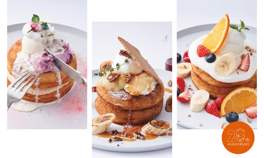 20周年アニバーサリーパンケーキ、月替りで毎月新登場!春爛漫の桜香るパンケーキや甘く芳醇なシュガーバターパンケーキなど、ビブリオテークの人気ふわもちパンケーキに特別限定メニューが仲間入り。