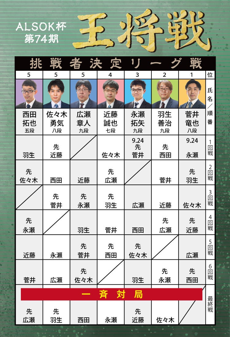 藤井聡太王将への挑戦権を獲得するのはどの棋士か。およそ2カ月間に及ぶ棋界屈指の難関リーグ『ALSOK杯 第74期王将戦 挑戦者決定リーグ戦』が9月24日(火)に開幕します。開幕局は、永瀬拓矢九段vs菅井竜也八段の組み合わせ。以降も対局が続々!10月1日(火)は佐々木勇気八段vs近藤誠也七段、10月3日(木)は羽生善治九段vs西田拓也五段の対局が決定しました!