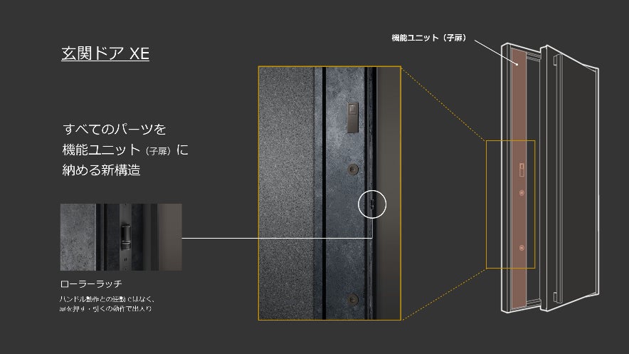 「XE」は、業界初となるさまざまなデバイスを機能ユニット(子扉)に収納する新発想のドアロック機構を採用することで、ハンドルの意匠や自由度を高めシンプルで美しいデザインを実現したほか、時代の移り変わりに合わせてデザインや機能をアップグレード(交換)できる対応力を持たせた、これまでの常識を覆す次世代の玄関ドアです。