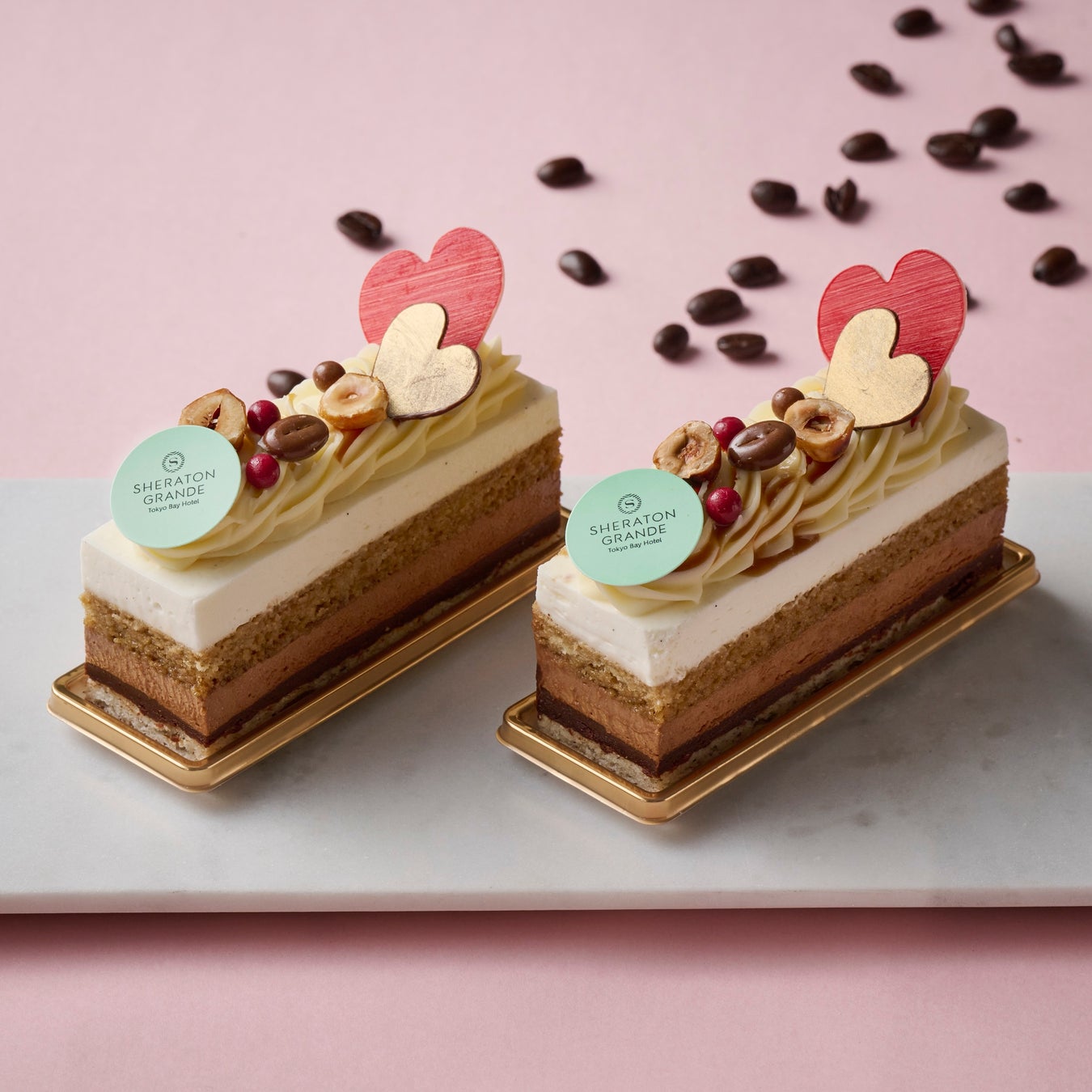 カフェモカムースやコーヒーガナッシュ、コーヒーシロップ漬けにしたジョコンドなどを重ねた、ほのかに感じるほろ苦さが上品なケーキです。仕上げに添えたハート型のチョコレートがバレンタインのワンシーンに幸せをお届けします。