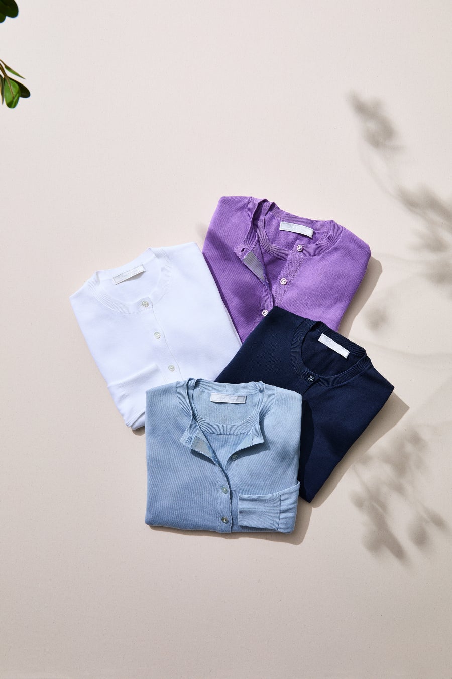 上質なスーピマコットンを使用したカーディガンは、ボタンを全て留めてプルオーバー風にお召しいただいたり、ドレスやカットソーの肩に巻いてコーディネートにアクセントを添えたり、様々なコーディネートで活躍する汎用性の高いアイテム。スーピマコットンならではの艶のある滑らかな質感と美しい発色が、日々のスタイリングをさりげなく格上げします。単品ではもちろん同生地のショートスリーブセーターと合わせてアンサンブルとしても着用可能です。